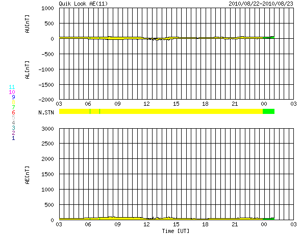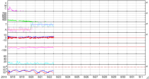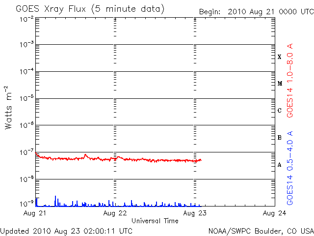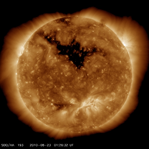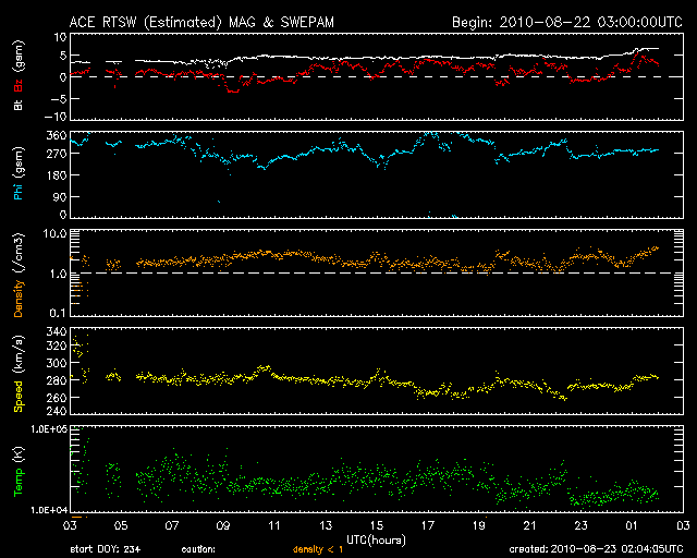 2010/ 8/23 11:04 更新 太陽風は低速の風が続いています。これから高速風がやって来ます。 担当 篠原 今日は、アメリカの新しい太陽観測衛星SDOによるコロナの写真を掲載します。 北半球に大きく、コロナホールの暗い穴が広がっています。 ちょうど太陽の中心線上にあり、 今、地球に向かって速度の高い太陽風が吹き出しているところです。 その風は、およそ3日で地球までやって来るので、 26日ごろには、かなり速度の高い太陽風が地球に吹きつけていることでしょう。 その太陽風は、現在は速度280km/秒とかなり遅い状態です。 27日周期の図では、グラフの下にはみ出しています。 この図で前周期(7月27日)を見ると、この頃から速度の上昇が始まっています。 すると、今日辺りから高速風の始まりがやって来るかもしれません。 ACEの図を見ると、まだ目立った気配はありませんが、 磁場強度がほんの少し、4nTから6nTほどに高まっています。 この変化が高速風の兆しの兆しかもしれません。 この後、更に磁場が強まるようだと、高速風の到来も近いでしょう。 いずれにせよ、太陽コロナの写真にあるように、3日後には強い風が吹いているはずです。 前周期は、最高速度が700km/秒に達し、500km/秒以上の高速風は6日間続きました。 今回も同程度の高速風がやってきそうです。 今後の変化に注目してください。 現在は、太陽風が低速のため、磁気圏も非常に静穏です。 AE指数は全く変化していません。 太陽も静かです。 黒点は無く、コロナの写真を見ても、強く光っている領域は見られません。 STEREO Behindで先回りをしても、 太陽の左側(これから地球側に回ってくる側)には、目立った活動領域はなく、 太陽は静かな状態が続きそうです。 SDO AIA 193による太陽コロナの様子 (c) SDO (NASA) ![]() SOHO衛星による太陽の可視光写真。マウスの矢印を写真に重ねると、黒点番号付きの写真に切り替わります。 (c) SOHO (ESA & NASA) ![]() ACEが観測した太陽風の磁場(1番上の枠、白線は全体の強度、赤線は南北成分) および、太陽風の密度(3番目の橙線)、速度(4番目の黄線) (c) NOAA/SWPC ![]() リアルタイムAE指数 下段のAEグラフの値が高くなると、オーロラ活動が活発化しています。 (c) 京都大学, NICT ![]() 27日の太陽周期に合わせたデータプロット 太陽が同じ面を地球に向けていた27日前の変化から、今後を予想することができます。 (c) 作図:宇宙天気ニュース