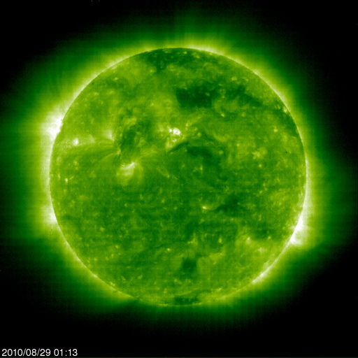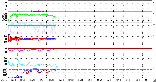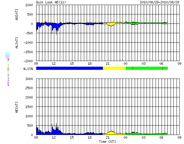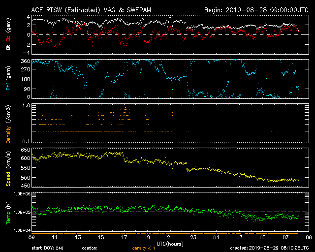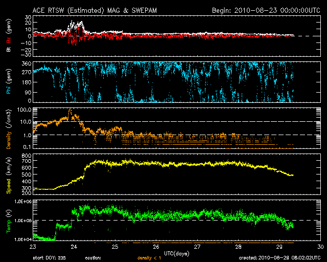 2010/ 8/29 17:10 更新 太陽風の速度は500km/秒を割り、高速太陽風は終わりつつあります。 担当 篠原 今日は更新システムにトラブルが発生し、記事の更新が遅くなってしまいました。 申し訳ありません。 遅ればせながら、今日の状況をまとめます。 高速太陽風は、昨日の昼頃から低下を始め、 昨日の650km/秒から、今朝の段階で550km/秒、 そして、現在、29日の夕方では、490km/秒まで下がっています。 前周期と比べると、下がり方も比較的短時間になっています。 高速風の全体像を見るため、今日の一枚目に7日幅のACEの図を掲載します。 この図の24日(世界時です)に、太陽風の速度は一気に700km/秒まで上がり、 その後、4日に渡って600km/秒を超える高い速度を保っていました。 図の後半は、28日に速度が下がり始め、最後のところで500km/秒まで落ちています。 この図では、速度が上昇する前に、 磁場強度(白線)とプラズマの密度(橙色)が大きく高まっていたことが分かります。 前にある低速の太陽風を、 後ろから高速の太陽風が追いかける領域に見られる、特徴的な変化です。 高速風の影響は、もうしばらく残るかもしれません。 それは、SOHO EIT195に見えていた、細長いコロナホールの影響です。 太陽風の速度は、既に500km/秒を割っていますが、 このまま400km/秒付近まで下がらず、やや高速の状態が続く可能性もあります。 注目してください。 一方、磁気圏のオーロラ活動はだいぶ静かになっています。 昨日までは、AE指数に500nT程度の変動も見られていたのですが、 図の中盤以降は、ほとんど変化がありません。 速度の低下と、磁場強度の弱まりの両方が効いているのでしょう。 今後は、一段と静かになっていくでしょう。 放射線帯の高エネルギー電子は、また少し回復して、10,000のレベルに戻っています。 しかし、もう大きな増加ではありません。 太陽の活動は静穏です。 X線のグラフは強度が下がり、変化もありません。 黒点は、中央やや左に、1101黒点群の大きな黒点と、 中央のやや北寄りに新しい黒点群が出現しています。 ACEによる、7日幅の太陽風の変化。今回の高速風の全体を見渡せます。 (c) NOAA/SWPC ![]() ACEが観測した太陽風の磁場(1番上の枠、白線は全体の強度、赤線は南北成分) および、太陽風の密度(3番目の橙線)、速度(4番目の黄線) (c) NOAA/SWPC ![]() SOHO衛星のEIT195カメラによる太陽コロナの様子 (c) SOHO (ESA & NASA) ![]() SOHO衛星による太陽の可視光写真。マウスの矢印を写真に重ねると、黒点番号付きの写真に切り替わります。 (c) SOHO (ESA & NASA) ![]() リアルタイムAE指数 下段のAEグラフの値が高くなると、オーロラ活動が活発化しています。 (c) 京都大学, NICT ![]() 27日の太陽周期に合わせたデータプロット 太陽が同じ面を地球に向けていた27日前の変化から、今後を予想することができます。 (c) 作図:宇宙天気ニュース