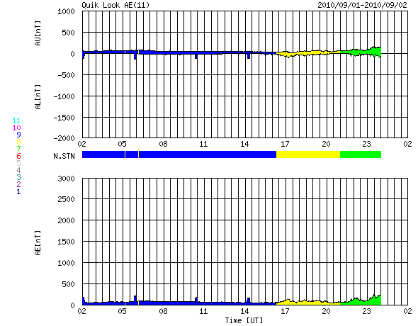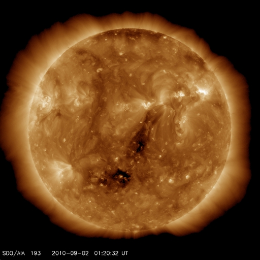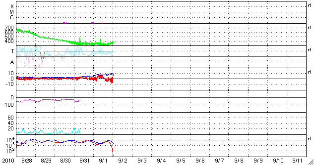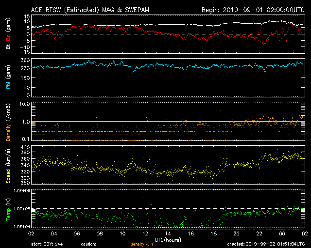 2010/ 9/ 2 10:52 更新 低速の太陽風が続いています。太陽に新しい黒点群が出現しています。 担当 篠原 太陽風は、低速の状態が続いています。 ACEの観測によると、太陽風の速度は、昨夜、320km/秒まで下がりました。 今朝くらいから少し上昇して、現在は360km/秒です。 また、希薄になっていたプラズマの密度は、 1個/cm^3と平均的なレベルまで回復しています。 太陽風の磁場強度は、昨日に続いて更に上昇し、一時的に10nTまで強まりました。 これは、プラズマ密度の回復や、速度の上昇と関係した変化だと思います。 磁場強度は、最新の値は7nTへ弱まっています。 この後、太陽風は特に乱れるということはなく、磁場強度は次第に下がっていくでしょう。 磁気圏も概ね静穏です。 磁場強度の強まりによって、磁場が-5nTを超える南向きになり、 AE指数のグラフが少し上昇していますが、 低速風でもあり、活動は特に大きくなることはないでしょう。 今日は、SDOのAIA193の太陽コロナ写真を掲載しています。 今日の写真を見ると、太陽の中心から南(下側)へ向かって、コロナホールが広がっています。 このコロナホールは、昨日の写真でも淡く見えていたのですが、 ここまで目立つ姿ではありませんでした。 小規模のコロナホールの場合、地球から見て斜めの位置にあるときは淡い色だったのが、 正面に来ると、急に濃く見えるということがあります。 今回もそのパターンだったようで、 この広がりだと、2日から3日後くらいに高速の太陽風が地球へやって来そうです。 27日周期の図では、前周期の8月9〜11日に小さな速度の山が来ていましたが、 その回帰となりそうです。 どの程度まで速度が高まるか、注目してください。 放射線帯の高エネルギー電子は、小規模の磁気圏活動に反応して、 減少を示しています。 GOESのグラフは、時間帯の関係もあって再び上がってきますが、 ピークは10,000からある程度下がってしまうと思います。 太陽では、新しい黒点群が複数出現しています。 今日の可視光写真の一番右に見えているのは、1102黒点群です。 この黒点群は、黒点の数が減り、規模は縮小しています。 しかし、そのすぐ左に新しい黒点が現われています。 この黒点は、1103黒点群です。 そして、掲載の写真ではほとんど見えないのですが、この1103群のすぐ左に、 もうひとつ新しく1104黒点群が現れています。 写真をよく見ると、そのずっと左側、太陽の中心やや右上にも黒点が見えています。 これは、まだ番号が付けれられていない様です。 ただし、X線のグラフは変化がなく、 黒点群は現れましたが、太陽のフレア活動は静穏です。 SDO AIA 193による太陽コロナの様子 (c) SDO (NASA) ![]() SOHO衛星による太陽の可視光写真。マウスの矢印を写真に重ねると、黒点番号付きの写真に切り替わります。 (c) SOHO (ESA & NASA) ![]() ACEが観測した太陽風の磁場(1番上の枠、白線は全体の強度、赤線は南北成分) および、太陽風の密度(3番目の橙線)、速度(4番目の黄線) (c) NOAA/SWPC ![]() リアルタイムAE指数 下段のAEグラフの値が高くなると、オーロラ活動が活発化しています。 (c) 京都大学, NICT ![]() 27日の太陽周期に合わせたデータプロット 太陽が同じ面を地球に向けていた27日前の変化から、今後を予想することができます。 (c) 作図:宇宙天気ニュース