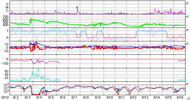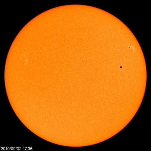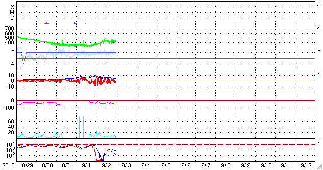 2010/ 9/ 3 09:58 更新 太陽面に黒点群が並んでいます。太陽風は平均的な速度に戻りました。 担当 篠原 太陽面に、小さな黒点がちらちら並んで、にぎやかです。 中心部のすぐ北に見える黒点は、1105群と番号が付きました。 EIT195を見ると、西端の1102黒点群から、1103、1104、1105群と、 4つの活動領域の輝きが、きれいに一直線に並んで見えます。 その一方、GOESのX線グラフは全く平坦で、フレア活動は見られません。 黒点群はいくつも現れているものの、活発な領域はない様です。 太陽風の速度は、昨夜のうちに440km/秒まで上がり、 その後、半日ほど安定した状態です。 磁場やプラズマ密度の様子を見ても、これ以上特に大きく変化することはないでしょう。 この後は、一旦落ち着いて、明後日くらいにコロナホールの影響がやって来るかどうかです。 そのコロナホールですが、今日はSOHO EIT195の太陽コロナ写真を掲載します。 昨日のSDOの写真と比較すると、コロナホールの濃さはそれほど強いものではありません。 今日の写真を見ると、あまり強い太陽風になることはなさそうです。 この違いは、カメラの特性や撮影後の画像処理の加減によるのだと思います。 観測データというものは、それぞれ個性を持っています。 何のデータにしても、その違いを把握しながら使うことが重要です。 磁気圏のオーロラ活動は、小規模ですが頻繁に観測されています。 これは、太陽風の速度が多少高まったことと、 磁場の南北成分が-5〜-3nTほどの南向きに振れていたためです。 磁場強度は下がってきたので、今後のオーロラ活動は一段小さくなるでしょう。 それでも、磁場が南北に振れていれば、発生を期待できます。 放射線帯の高エネルギー電子は、1,000のレベルまで大きく低下しました。 この後は、低い状態が続くでしょう。 SOHO衛星のEIT195カメラによる太陽コロナの様子 (c) SOHO (ESA & NASA) ![]() SOHO衛星による太陽の可視光写真。マウスの矢印を写真に重ねると、黒点番号付きの写真に切り替わります。 (c) SOHO (ESA & NASA) ![]() GOES衛星の太陽X線データ (c) NOAA/SWPC ![]() ACEが観測した太陽風の磁場(1番上の枠、白線は全体の強度、赤線は南北成分) および、太陽風の密度(3番目の橙線)、速度(4番目の黄線) (c) NOAA/SWPC ![]() リアルタイムAE指数 下段のAEグラフの値が高くなると、オーロラ活動が活発化しています。 (c) 京都大学, NICT ![]() 27日の太陽周期に合わせたデータプロット 太陽が同じ面を地球に向けていた27日前の変化から、今後を予想することができます。 (c) 作図:宇宙天気ニュース