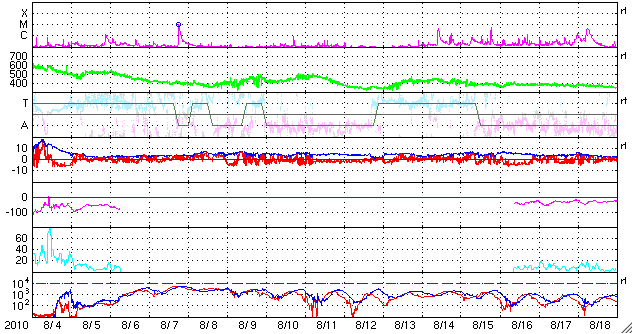 2010/ 8/31 13:32 太陽風の速度は340km/秒まで下がっています。磁気圏はとても静かです。