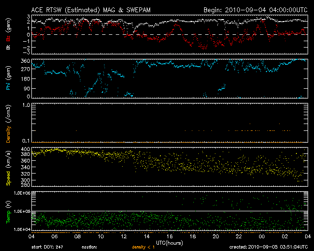 2010/ 9/ 4 13:21 太陽風の密度が小さくなっています。速度はやや遅めで、磁気圏は静穏です。