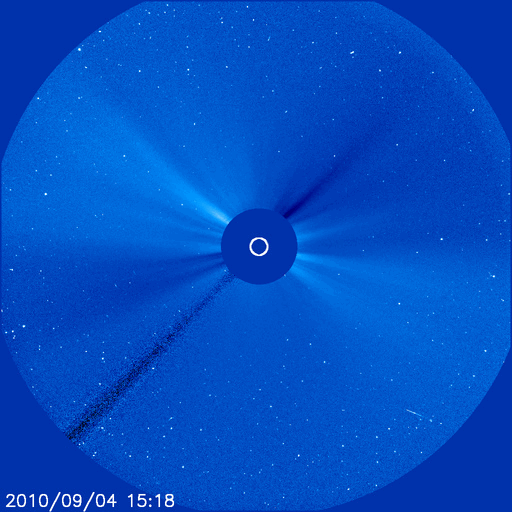 太陽から西に向かってCMEが広がっています。SOHO LASCO C3カメラ。