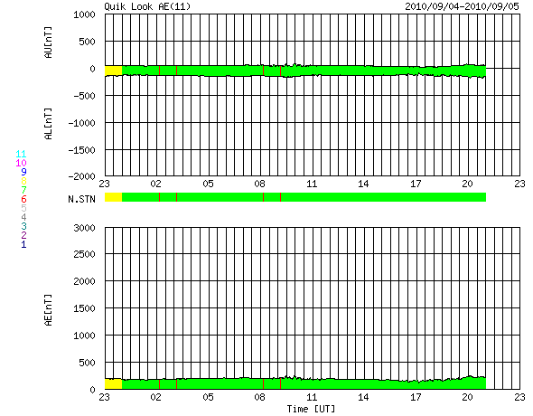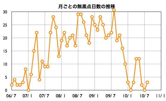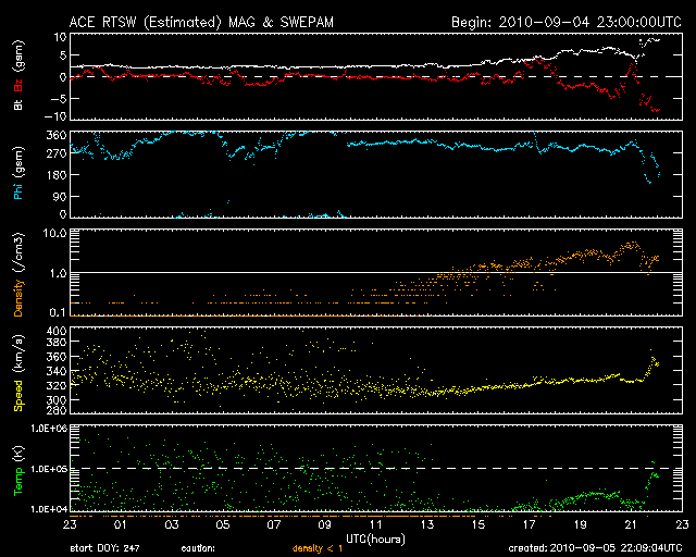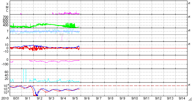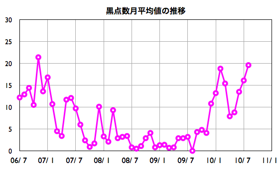 2010/ 9/ 6 07:09 更新 太陽風の磁場強度が強まり、これから速度がやや上がるかもしれません。8月の黒点をまとめます。 担当 篠原 SIDCより、8月の黒点数が発表されました。 これによると、月間の平均黒点数は19.6、黒点のない日は3日間でした。 8月も、黒点はほぼ毎日現われ、 月平均値は今回の活動周期としては最高値になっています。 確かに、この頃は黒点群が複数現われている日が多くなっている印象です。 NOAAのデータになりますが、1日ごとの黒点群の数を足し合わせてみると、 6月は39個、7月は45個、そして、8月は67個と、大きく増加しています。 SOHOの可視光写真を見ていてにぎやかに感じられるのは、数字としても確かな様です。 現在の太陽風は、プラズマの密度が回復し、 磁場強度は10nT、速度は360km/秒へとそれぞれ上昇しています。 コロナホールの影響が現われ始めているのかもしれません。 速度が大きく上がることはないと思いますが、どの程度まで変化するでしょうか。 磁気圏活動も、ここまでは非常に静かです。 現在、磁場強度が強まっていて、しかも南北成分は大きく南を向いています。 速度が遅いため、磁気圏への影響は小規模に留まるでしょうが、 オーロラ活動がある程度活発になる可能性があります。 27日周期の図によると、 これから太陽風の速度が高まれば、その影響は2日ほど続くと思われます (前周期の8月10、11日の速度変化の回帰)。 コロナホールの影響を抜けると、再び太陽風の速度は遅くなり、 穏やかな状態がしばらく続きます。 太陽では、1105黒点群の活動がやや強まっています。 Bクラスの小さなフレアを頻繁に起こしているそうです。 X線のデータを見ると、最大でB5くらいの変化を起こしています。 更に強まって、Cクラスのフレアを起こすようになるかもしれません。 引き続き注目してください。 2006年7月以降の、月ごとの無黒点日数の変化。 (c) データ : SIDC、作図 : 宇宙天気ニュース ![]() 2006年7月以降の、黒点数の月平均値。 (c) データ : SIDC、作図 : 宇宙天気ニュース ![]() SOHO衛星のEIT195カメラによる太陽コロナの様子 (c) SOHO (ESA & NASA) ![]() SOHO衛星による太陽の可視光写真。マウスの矢印を写真に重ねると、黒点番号付きの写真に切り替わります。 (c) SOHO (ESA & NASA) ![]() ACEが観測した太陽風の磁場(1番上の枠、白線は全体の強度、赤線は南北成分) および、太陽風の密度(3番目の橙線)、速度(4番目の黄線) (c) NOAA/SWPC ![]() リアルタイムAE指数 下段のAEグラフの値が高くなると、オーロラ活動が活発化しています。 (c) 京都大学, NICT ![]() 27日の太陽周期に合わせたデータプロット 太陽が同じ面を地球に向けていた27日前の変化から、今後を予想することができます。 (c) 作図:宇宙天気ニュース
