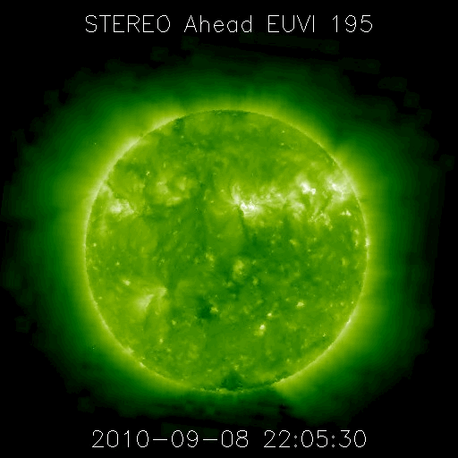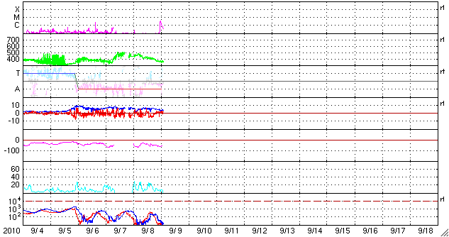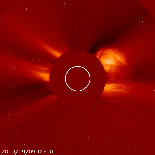 2010/ 9/ 9 11:20 更新 C3.4の小規模フレアが発生しました。太陽風は低速風に戻っています。 担当 篠原 今朝、9日8時(世界時8日23時)に、C3.4の小規模フレアが発生しました。 地球から見て太陽の西の端に没したばかりの、1105黒点群で発生したようです。 半分太陽の陰に入っていることから、 フレアの本当の規模は、もう一回り大きかったのかもしれません。 STEREO Aheadで見たフレアの動画を、1枚目に掲載します。 フレアに伴って、フィラメントの噴出がSDOのAIA304によって撮影されています。 今日の2枚目の写真です。 見事な太陽コロナの吹き上がりです。 9月5日に掲載した写真と、雰囲気が良く似ています。 太陽の直径は、地球の110倍ほどもあります。 それを考えて写真を見直すと、このフィラメントがいかに巨大であるか、よく分かります。 そして、太陽の西に向かって、CME(太陽ガスの放出現象)が飛び出しています。 SOHO LASCO C2の写真を掲載します。 まだ飛び出したばかりなので、明日になれば動画などを紹介できるでしょう。 地球から見ると横に向かって飛び出しているので、影響はありません。 その太陽ですが、1105黒点群が向こう側に行ってしまったため、 今日は無黒点になっているようです。 3日ほどすると、東側から比較的規模の大きい活動領域が上がってきそうですが、 その頃まで無黒点が続くかもしれません。 太陽風は、昨日のニュース以降は、速度はずっと下がり続け、 現在は350km/秒とすっかり低速風になってしまいました。 速度の高まりは、1日程度でした。 磁場強度は、5nTと平均的な状態を保っています。 この中で、磁場の南北成分がずっと南寄りになっていた時間帯があり、 活発なオーロラ活動を作りました。 AE指数では、500nTから、最大800nTに達する中規模の活動が、 6時間にわたって観測されています。 この頃は、太陽風の速度も400km/秒ほどあったため、 ある程度活発な変動になったのでしょう。 現在の太陽風は、350km/秒まで速度が下がってしまっています。 今後は、あまり活発なオーロラ活動は期待できません。 掲載している27日周期の図では、 次の高速風は、前周期のグラフにはまだ現れていません。 10日以上にわたって、穏やかな太陽風となりそうです。 STEREO Aheadによる、C3.4フレアの様子。コロナのガスが噴き出していく様子も見えます。 (c) STEREO (NASA)、動画加工 : 宇宙天気ニュース ![]() 太陽の西の端で発生した、フィラメントの噴出。SDO AIA304カメラ。 (c) SDO (NASA) ![]() 太陽から西に向かってCMEが飛び出しています。 (c) SOHO (ESA & NASA) ![]() SOHO衛星のEIT195カメラによる太陽コロナの様子 (c) SOHO (ESA & NASA) ![]() SOHO衛星による太陽の可視光写真。マウスの矢印を写真に重ねると、黒点番号付きの写真に切り替わります。 (c) SOHO (ESA & NASA) ![]() GOES衛星の太陽X線データ (c) NOAA/SWPC ![]() ACEが観測した太陽風の磁場(1番上の枠、白線は全体の強度、赤線は南北成分) および、太陽風の密度(3番目の橙線)、速度(4番目の黄線) (c) NOAA/SWPC ![]() リアルタイムAE指数 下段のAEグラフの値が高くなると、オーロラ活動が活発化しています。 (c) 京都大学, NICT ![]() 27日の太陽周期に合わせたデータプロット 太陽が同じ面を地球に向けていた27日前の変化から、今後を予想することができます。 (c) 作図:宇宙天気ニュース