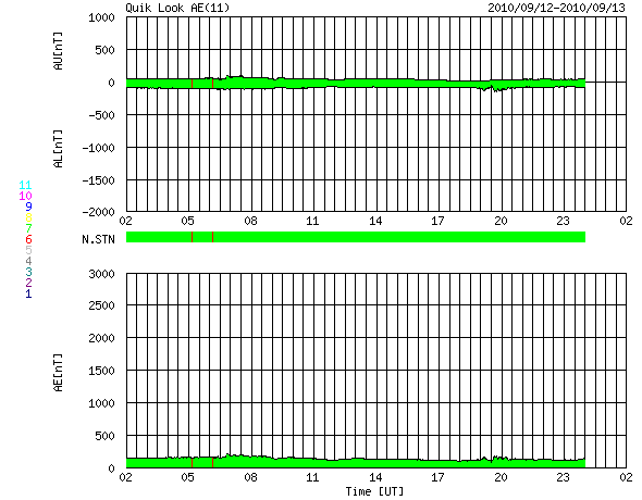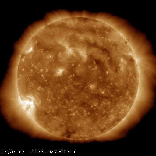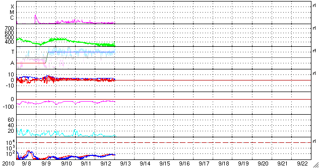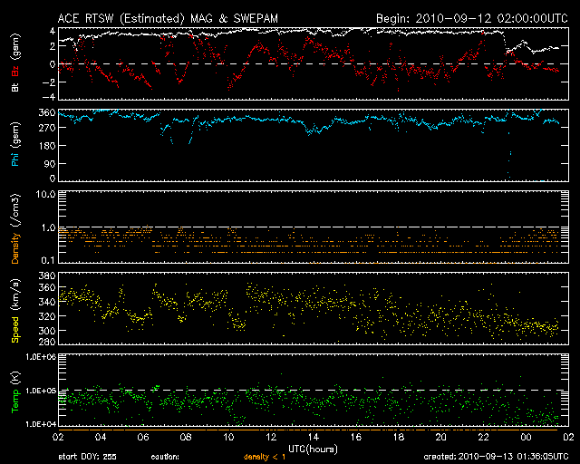 2010/ 9/13 10:37 更新 太陽風は300km/秒の低速状態です。太陽活動も穏やかです。 担当 篠原 太陽風の速度は、300km/秒へ下がり、かなり遅い風になっています。 プラズマの密度も少なくなって、速度データがやや散らばっています。 磁場強度は、2〜4nTの間を変化しています。 やや弱めの傾向は続いています。 磁気圏のオーロラ活動もたいへん静かです。 AE指数は全く変化していません。 11日に発生したCMEの影響は、 明日か明後日くらいに地球へやって来る可能性があります。 それがなければ、遅い風はこのまま1週間程度続くと思われます。 27日周期の図を見ると、 8月24日に発生した高速太陽風の回帰は、9月20日頃と予想されます。 発生源にあたるコロナホールは、STEREO Behindで見ることができます。 もうすぐ、太陽のこちら側に姿を現しそうです。 前周期のこの高速風では、オーロラ活動も活発になりました。 オーロラ観望では楽しみに待っていて下さい。 太陽では、X線の変化はほとんどなくなっています。 可視光写真を見ると、1106黒点群は白斑も従えて迫力ある見え方をしていますが、 活動度は下がっている様に見えます。 また、太陽の北東(左上)に、1107黒点群が現れました。 掲載の可視光写真では、白斑の中にとても小さな黒い点が見えている様です。 6時間ほど前の写真ではもう少しはっきりと見えていたので、 このまま消えてしまうのかもしれません。 SDO衛星のAIA193カメラによる太陽コロナの様子 (c) SDO (NASA) ![]() SOHO衛星による太陽の可視光写真。マウスの矢印を写真に重ねると、黒点番号付きの写真に切り替わります。 (c) SOHO (ESA & NASA) ![]() ACEが観測した太陽風の磁場(1番上の枠、白線は全体の強度、赤線は南北成分) および、太陽風の密度(3番目の橙線)、速度(4番目の黄線) (c) NOAA/SWPC ![]() リアルタイムAE指数 下段のAEグラフの値が高くなると、オーロラ活動が活発化しています。 (c) 京都大学, NICT ![]() 27日の太陽周期に合わせたデータプロット 太陽が同じ面を地球に向けていた27日前の変化から、今後を予想することができます。 (c) 作図:宇宙天気ニュース