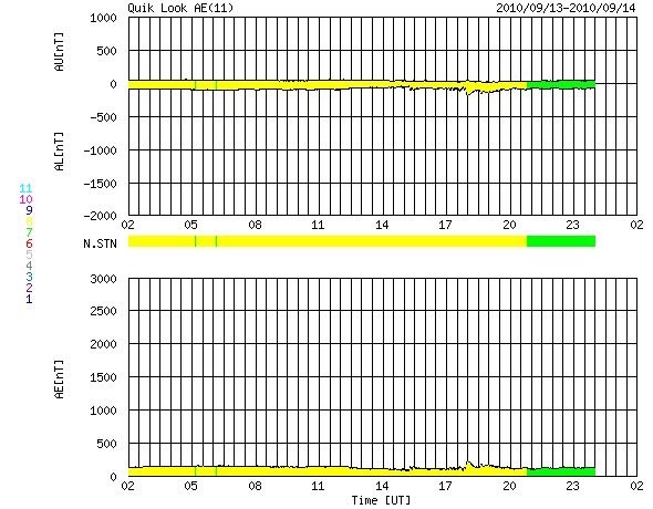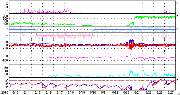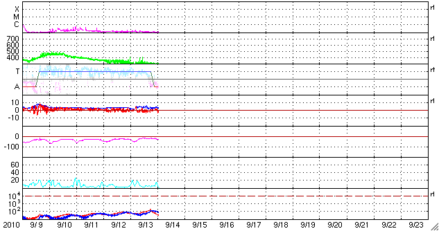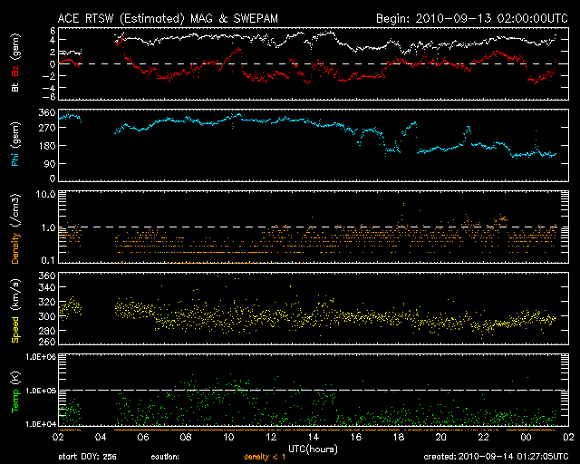 2010/ 9/14 10:27 更新 太陽風は低速で、磁気圏も静かです。太陽も静穏です。 担当 篠原 太陽風は、300km/sとかなり遅い速度で安定しています。 磁場強度は、4nT前後を変化していて、 平均的な強さです。 磁場の南北成分は、南北に振れながら変化していますが、 速度が遅いため、オーロラの活動は低調です。 AE指数は全く変化していません。 太陽風は、11日のCMEの影響が、 今日から明後日くらいにかけて、 やって来る可能性があります。 乱れとしては、小規模に留まるでしょう。 それがなければ、穏やかな太陽風は、 27日周期の図によると、20日頃まで続くと予想されます。 ただし、今日のSOHO EIT195によると、 発生源のコロナホールの位置は、 東側に少しずれている様です。 そうであれば、高速風の到来は遅れることになります。 明後日くらいになると、 よりはっきりと分かるでしょう。 太陽の活動は、穏やかです。 X線のグラフは、目立った変化をしていません。 1106黒点群の活動は、低調の様です。 SOHO衛星のEIT195カメラによる太陽コロナの様子 (c) SOHO (ESA & NASA) ![]() SOHO衛星による太陽の可視光写真。マウスの矢印を写真に重ねると、黒点番号付きの写真に切り替わります。 (c) SOHO (ESA & NASA) ![]() ACEが観測した太陽風の磁場(1番上の枠、白線は全体の強度、赤線は南北成分) および、太陽風の密度(3番目の橙線)、速度(4番目の黄線) (c) NOAA/SWPC ![]() リアルタイムAE指数 下段のAEグラフの値が高くなると、オーロラ活動が活発化しています。 (c) 京都大学, NICT ![]() 27日の太陽周期に合わせたデータプロット 太陽が同じ面を地球に向けていた27日前の変化から、今後を予想することができます。 (c) 作図:宇宙天気ニュース