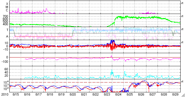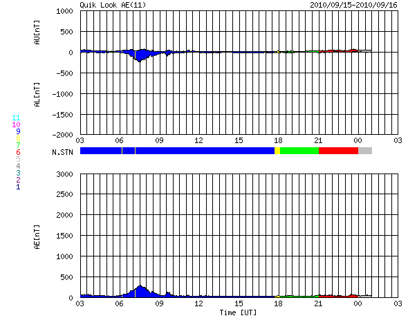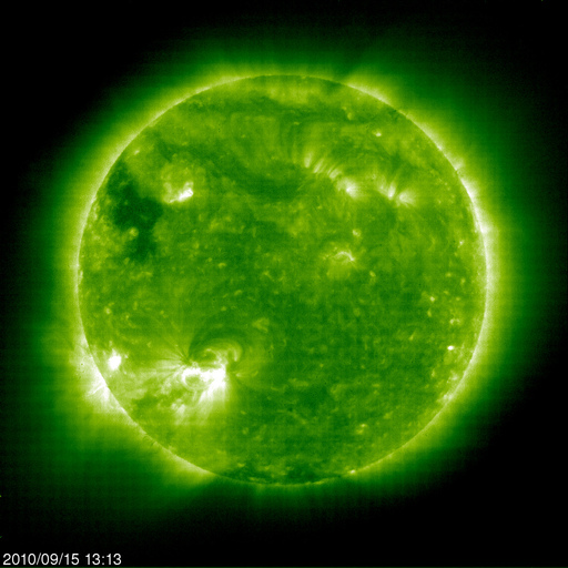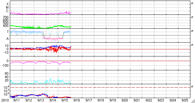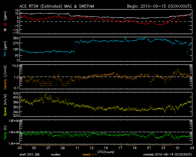 2010/ 9/16 11:53 更新 太陽風は低速風に戻りました。磁気圏は静かです。 担当 篠原 太陽風速度の小さな高まりは1日で終わり、 昨夜のうちに速度は下がって、360km/秒と低速風になりました。 また、これまでのところCMEの影響は特に発生していないようです。 磁気圏は、静穏な状態が続いています。 これは、太陽風の磁場が北寄りに推移しているためでしょう。 太陽風は、今後も基本的には低速の穏やかな状態が続くと思われます。 コロナホールによる高速風の回帰ですが、 SOHO EIT195による、現在の太陽コロナ写真と、27日前の写真を比較しましょう。 2枚並んでいるEIT195の小さな写真は、左は現在の太陽、右は1自転前(27日前)の太陽です。 どちらも、北東(左上)にコロナホールが広がっています。 しかし、その迫り出しは、右の前周期の時よりも今回(左)は小さくなっています。 その引っ込んだ部分には、1107黒点群のあった活動領域が明るく光っています。 この様子では、高速太陽風の始まりは1〜2日ほど遅れそうです。 27日周期の図によると、高速風の始まりは9月20日頃と予想できますが、 少し修正が必要の様です。 太陽では、1106黒点群と、北東部の活動領域で Bクラスの小さなフレアが発生しています。 また、南東(左下)の向こう側にある活動領域も小規模ですが変動を続けています。 規模は限定的ですが、太陽はしばらくにぎやかな状態が続くかもしれません。 SOHO衛星のEIT195カメラの映像 (c) SOHO (ESA & NASA)