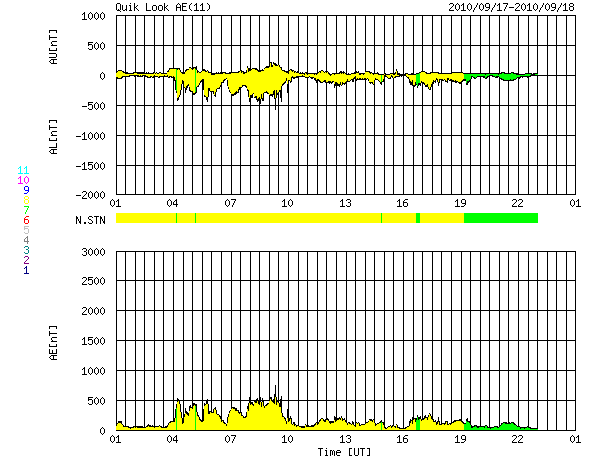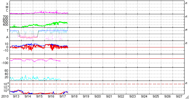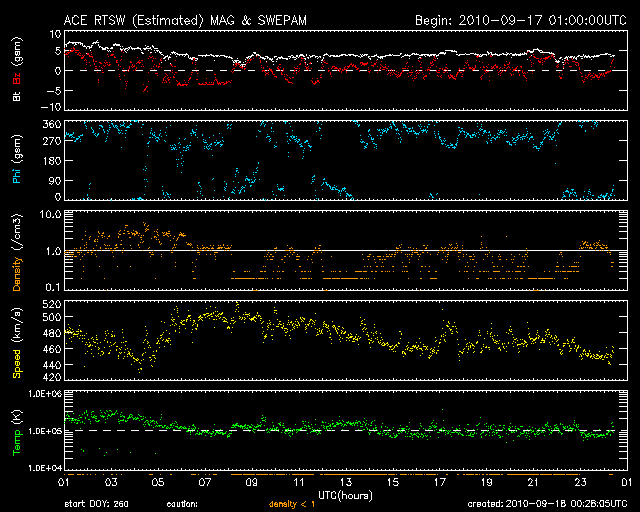 2010/ 9/18 09:29 更新 太陽風は、やや高速です。1108黒点群が大きな姿を現しました。 担当 篠原 太陽風は、500km/sから460km/sと、やや高速の状態が続いています。 磁場強度も、5nTと平均的なレベルを保っています。 速度の高まりは、もうしばらく続くのかもしれません。 AE指数の図は、前半に500nTの活動が続き、 後半は小さくなっています。 これは、太陽風の磁場の向きが、南寄りから北寄りに変わったためです。 まだ、太陽風の速度は高めなので、 再び南寄りに変われば、小規模ですがオーロラは発生し易い状態です。 27日周期の図では、前周期の高速風が近づいて来ました。 しかし、SOHO EIT195では、 コロナホールはまだ太陽の中心に達していません。 今回の高速風の到来は、 もう4日程度先になりそうです。 太陽で昨日発生したC1の小規模フレアは、 東端に現れた1108黒点群で発生したものでした。 1108黒点群は、今日の可視光写真ではとても大きな姿を見せています。 しかし、活動度はそれほど高くないようで、 X線のグラフは、Bクラスの小さな変化がいくつか見られているだけです。 ただし、規模は大きいので、もうしばらく注目して下さい。 SOHO衛星のEIT195カメラによる太陽コロナの様子 (c) SOHO (ESA & NASA) ![]() SOHO衛星による太陽の可視光写真。マウスの矢印を写真に重ねると、黒点番号付きの写真に切り替わります。 (c) SOHO (ESA & NASA) ![]() ACEが観測した太陽風の磁場(1番上の枠、白線は全体の強度、赤線は南北成分) および、太陽風の密度(3番目の橙線)、速度(4番目の黄線) (c) NOAA/SWPC ![]() リアルタイムAE指数 下段のAEグラフの値が高くなると、オーロラ活動が活発化しています。 (c) 京都大学, NICT ![]() 27日の太陽周期に合わせたデータプロット 太陽が同じ面を地球に向けていた27日前の変化から、今後を予想することができます。 (c) 作図:宇宙天気ニュース
