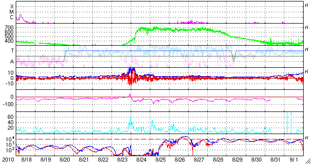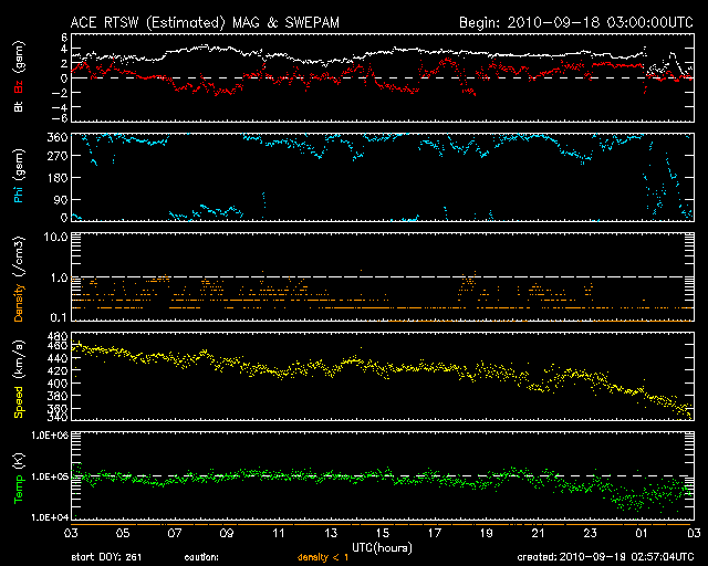 2010/ 9/15 10:17 太陽風磁場が強まり、速度は400km/秒に上がっています。オーロラ活動がやや活発化しています。