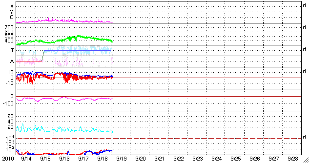 2010/ 9/16 11:53 太陽風は低速風に戻りました。磁気圏は静かです。