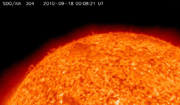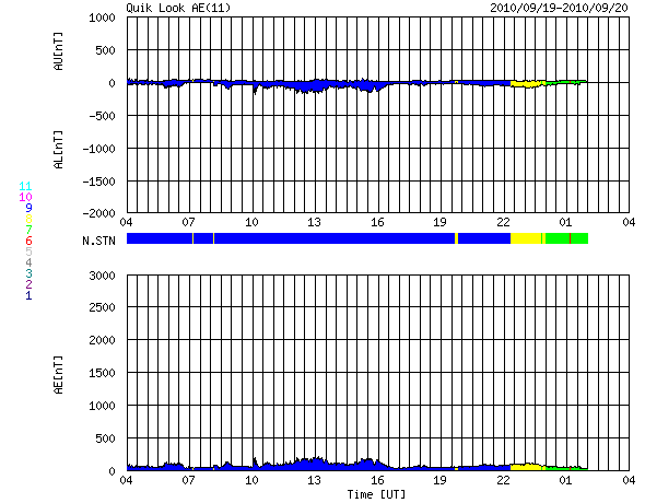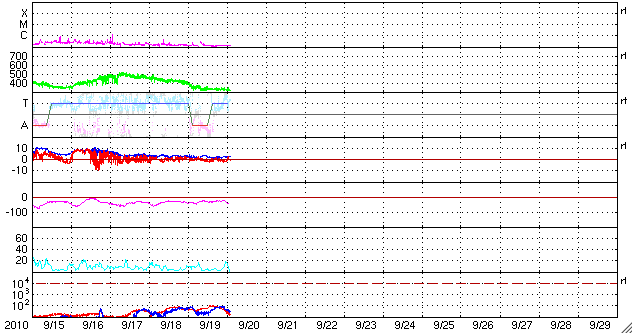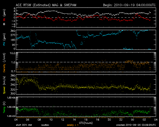 2010/ 9/20 12:10 更新 太陽風は320km/秒まで低速になっています。太陽の活動も穏やかです。 担当 篠原 今日は、SDOによる素晴らしい太陽の映像を紹介しましょう。 1枚目に掲載している動画は、18日から19日の2日間にわたる、 太陽北縁付近のプロミネンスの活動です。 渦を巻いている様に見えたり、噴き上がったり、複雑な動きが大規模に発生しています。 動画では一瞬ですが、画面の右側からプロミネンスのループが、 太陽の上空へ向かって噴き出していく姿も写っています。 やや容量が大きいので、ダウンロードに時間がかかる方は申し訳ありません。 さて、太陽風は、320km/秒と一段と低速になっています。 磁場強度も2〜3nTまで弱まっていて、 高速風の到来まで、このまま穏やかな状態が続きそうです。 磁気圏の活動も概ね静穏で、AE指数は小さな変化が見られるだけです。 SOHO EIT195では、コロナホールは西側に移動し、高速風の到来が近づいています。 22日頃に始まると予想していますが、どうなるでしょうか。 明日以降はACEのデータに注目してください。 前周期は、一気に600km/秒台後半に速度が上昇し、 5日に渡って、かなり高い速度を保ちました。 現在のコロナホールの規模は、やや縮小している様に感じられます。 やって来る高速風の規模がどの程度になるか注目して下さい。 太陽は、1106黒点群が西の端に近づき、1108黒点群は中心へ近づいています。 GOESのX線観測によると、それぞれの領域でBクラスの小さなフレアが発生していますが、 活動度としては穏やかなままです。 SDO AIA304による、太陽北縁付近のプロミネンスの活動。 (c) SDO (NASA)、動画加工 : 宇宙天気ニュース ![]() SOHO衛星のEIT195カメラによる太陽コロナの様子 (c) SOHO (ESA & NASA) ![]() SOHO衛星による太陽の可視光写真。マウスの矢印を写真に重ねると、黒点番号付きの写真に切り替わります。 (c) SOHO (ESA & NASA) ![]() ACEが観測した太陽風の磁場(1番上の枠、白線は全体の強度、赤線は南北成分) および、太陽風の密度(3番目の橙線)、速度(4番目の黄線) (c) NOAA/SWPC ![]() リアルタイムAE指数 下段のAEグラフの値が高くなると、オーロラ活動が活発化しています。 (c) 京都大学, NICT ![]() 27日の太陽周期に合わせたデータプロット 太陽が同じ面を地球に向けていた27日前の変化から、今後を予想することができます。 (c) 作図:宇宙天気ニュース