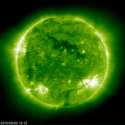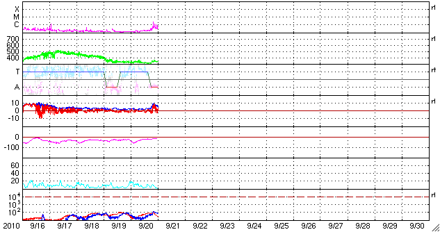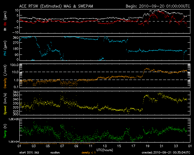 2010/ 9/21 09:32 更新 高速太陽風の到来が近づいているかもしれません。太陽でCクラスのフレアが発生しています。 担当 篠原 高速太陽風の到来が近づいているかもしれません。 ACEのデータによると、今日未明、21日3時(世界時20日18時)頃から、 太陽風の磁場強度が3nTから10nTへ強まり、 プラズマの密度も、1個/cm^3から20個/cm^3へ増加しています。 これらは、高速風の始まりによく見られる変化で、 速度はまだ変化していませんが、これから上昇を始めるかもしれません。 磁場強度とプラズマ密度の変化を前周期と比較すると、ともに増え方は小さくなっています。 その場合、速度の増加は、前周期ほどではないかもしれません。 一方、今回のコロナホールの位置や、STEREO Behindのデータから考えると、 高速風の到来は、もう半日くらい遅れる可能性もあります。 この辺りも注目してください。 磁場強度が強まったことで、今後のオーロラ活動に注目してください。 ここまでは、南北成分は北寄りに推移していて、 このため、AE指数はほとんど変化していません。 しかし、この後、南向きに傾向が替わって、速度の上昇が重なるなどした場合、 オーロラ活動は一気に強まります。 コロナホールによる高速太陽風では、 磁場強度が高めである前半ほど、オーロラ活動も強まりやすくなります。 これから明日、明後日にかけては、オーロラ観望の狙い目です。 太陽では、今朝、21日4時半(世界時20日19時半)に、 C2の小規模フレアが発生しました。 発生したのは、太陽の北半球の東端(左端)の明るい領域とのことです。 STEREO Behindによると、この領域はその少し前にもフレアを起こしています。 この領域は、まだ半分隠れているため、 フレアの本当の規模は、C2よりも大きかった可能性があります。 X線のグラフでは、C2の後にもC1やそれに次ぐ規模のフレアが観測されています。 活動領域がこちら側に回ってくることからも、今後の活動に注目が必要です。 SOHO衛星のEIT195カメラによる太陽コロナの様子 (c) SOHO (ESA & NASA) ![]() SOHO衛星による太陽の可視光写真。マウスの矢印を写真に重ねると、黒点番号付きの写真に切り替わります。 (c) SOHO (ESA & NASA) ![]() ACEが観測した太陽風の磁場(1番上の枠、白線は全体の強度、赤線は南北成分) および、太陽風の密度(3番目の橙線)、速度(4番目の黄線) (c) NOAA/SWPC ![]() リアルタイムAE指数 下段のAEグラフの値が高くなると、オーロラ活動が活発化しています。 (c) 京都大学, NICT ![]() 27日の太陽周期に合わせたデータプロット 太陽が同じ面を地球に向けていた27日前の変化から、今後を予想することができます。 (c) 作図:宇宙天気ニュース