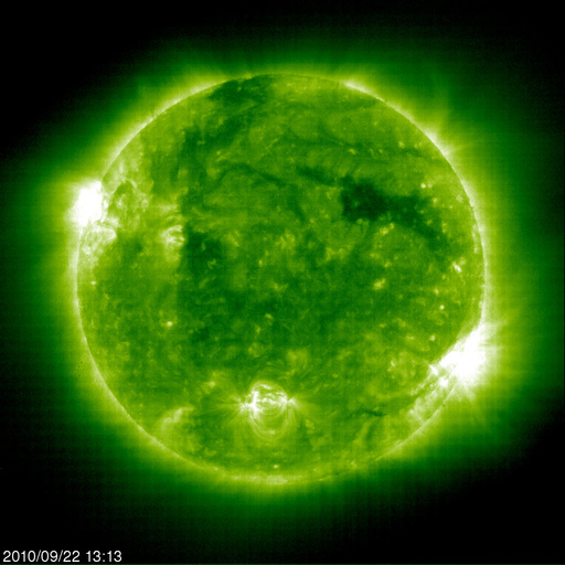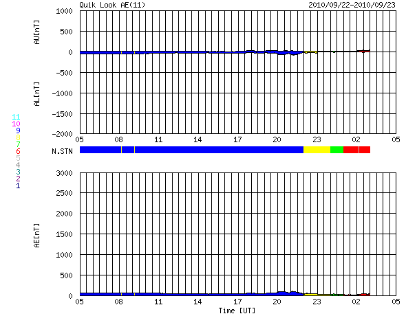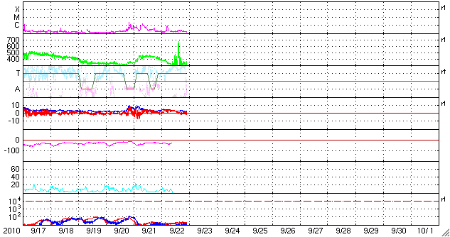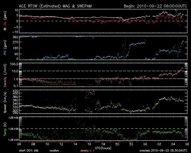 2010/ 9/23 14:40 更新 低速の太陽風が続いています。高速風の到来は、かなり遅れています。 担当 篠原 トラブル発生のため、10分ごとの最新情報の更新ができなくなっています。 日曜日までは、ニュース記事のみ1日1回更新します。 ご不便をおかけして、申し訳ありません。 昨日のニュースより、1日半近く経過しましたが、 依然、太陽風は350km/秒と低速の状態が続いています。 27日周期の図を参照すると、前周期の変動から既に3日も経過しています。 かなり遅れている印象です。 ACEの最新データを見ると、プラズマの密度が20個/cm^3へ増加しています。 今度こそ、高速風の兆しかもしれません。 磁場強度は、5〜8nT付近を変動していますが、 まだ、はっきりとした強まりには見えません。 今後、しっかりと強まってくるようだと、いよいよ速度も上昇を始めるでしょう。 SOHO EIT195を見ると、コロナホールは既にかなり西側へ移動しています。 この様に、遅れ気味に影響がやって来るとすると、 高速風の規模は前周期よりも一段弱まったものになる可能性があります。 前周期は、700km/秒に近い高速風がやって来ましたが、 今回は、そこまでの勢いはない様に思います。 引き続き、ACEの変化に注目してください。 磁気圏のオーロラ活動は、現在はたいへん静かです。 AE指数は全く変化していません。 太陽では、北東(左上)の1109黒点群が、B8.5の小さなフレアを起こしています。 目立った活動はこの程度で、太陽は穏やかです。 SOHO衛星のEIT195カメラによる太陽コロナの様子 (c) SOHO (ESA & NASA) ![]() SOHO衛星による太陽の可視光写真。マウスの矢印を写真に重ねると、黒点番号付きの写真に切り替わります。 (c) SOHO (ESA & NASA) ![]() ACEが観測した太陽風の磁場(1番上の枠、白線は全体の強度、赤線は南北成分) および、太陽風の密度(3番目の橙線)、速度(4番目の黄線) (c) NOAA/SWPC ![]() リアルタイムAE指数 下段のAEグラフの値が高くなると、オーロラ活動が活発化しています。 (c) 京都大学, NICT ![]() 27日の太陽周期に合わせたデータプロット 太陽が同じ面を地球に向けていた27日前の変化から、今後を予想することができます。 (c) 作図:宇宙天気ニュース