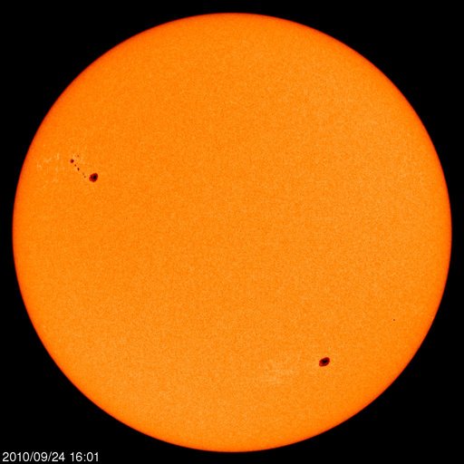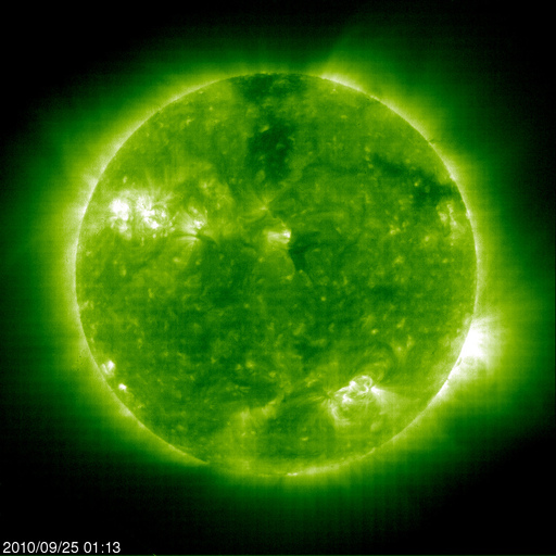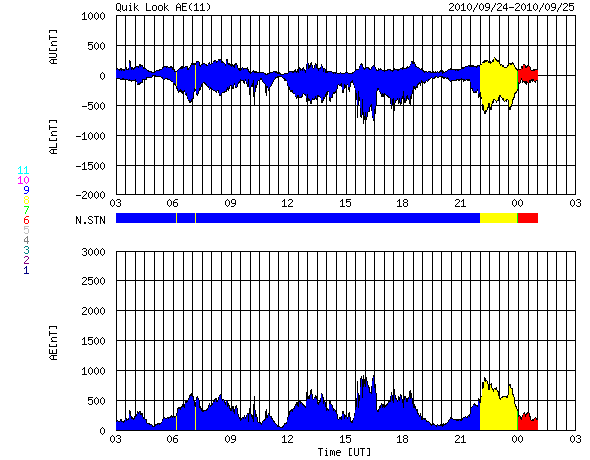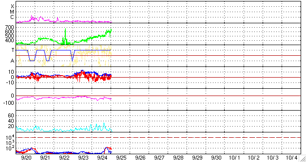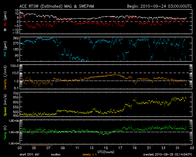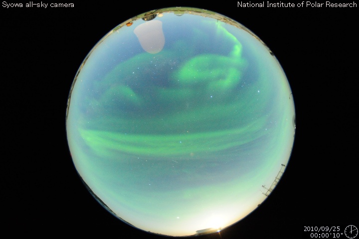 2010/ 9/25 11:30 更新 高速の太陽風がやって来ました。速度は630km/秒へ上昇しています。 担当 篠原 昨日、高速風領域は弱まってしまったのではないかと書きましたが、 昨日の夕方に、速度は500km/秒へ上がり、 そして、日付が25日に変わった頃(日本時間)から、速度は更に上昇して、 現在、630km/秒とかなり高い速度に変わっています。 27日周期の図を参照すると、前周期よりも4日以上遅れての上昇です。 しかも、SOHO EIT195の太陽コロナを見ると、 発生源のコロナホールは、もう半分は西の端に消えつつあります。 前周期とのずれのうち、2日分くらいは、 コロナホールの分布の変化による影響が考えられます。 しかし、それ以上に遅れ、コロナホールがこれだけ西の端に進んでいるということは、 コロナホールから出ている高速の太陽風のうち、後ろ側の領域だけが、 地球に当たっているということなのかもしれません。 コロナホールの様子から、単純に考えると、 高速風はそれほど長く続かないと思います。 明日くらいまでではないでしょうか。 今後の変化、更に、27日後にどのような風が回帰してくるか興味が持たれます。 太陽風の速度が上昇するとともに、 磁場の南北成分が南寄りに切り替わっています。 そのため、オーロラ活動も活発化しています。 AE指数では、500〜800nTの中規模活動が連続して発生しています。 満月過ぎの大きな月が明るく光っているのが残念ですが、 昭和基地では美しいオーロラを観測できたようです。 引き続き、今夜もライブカメラ(Live!オーロラ)のチャンスでしょう。 太陽では、北東の1109黒点群に小さな黒点が多数発生しています。 昨日まで見えていた、右の大きな黒点と左の小さな黒点の間をつなぐように、 黒点の行列ができています。 しかし、今のところフレア活動は静穏で、X線のグラフはほとんど変化していません。 黒点の発達に伴って活動度に変化が生じないか、しばらく注目してください。 トラブル発生のため、10分ごとの最新情報の更新ができなくなっています。 日曜日までは、ニュース記事のみ1日1回更新します。 ご不便をおかけして、申し訳ありません。 南極の昭和基地で、全天カメラにより撮影されたオーロラ。 (c) 国立極地研究所 ![]() SOHO衛星のEIT195カメラによる太陽コロナの様子 (c) SOHO (ESA & NASA) ![]() SOHO衛星による太陽の可視光写真。マウスの矢印を写真に重ねると、黒点番号付きの写真に切り替わります。 (c) SOHO (ESA & NASA) ![]() ACEが観測した太陽風の磁場(1番上の枠、白線は全体の強度、赤線は南北成分) および、太陽風の密度(3番目の橙線)、速度(4番目の黄線) (c) NOAA/SWPC ![]() リアルタイムAE指数 下段のAEグラフの値が高くなると、オーロラ活動が活発化しています。 (c) 京都大学, NICT ![]() 27日の太陽周期に合わせたデータプロット 太陽が同じ面を地球に向けていた27日前の変化から、今後を予想することができます。 (c) 作図:宇宙天気ニュース