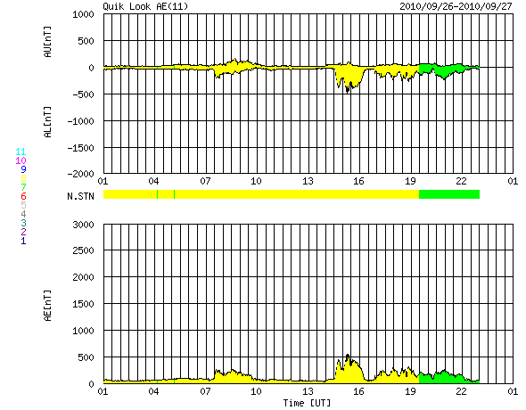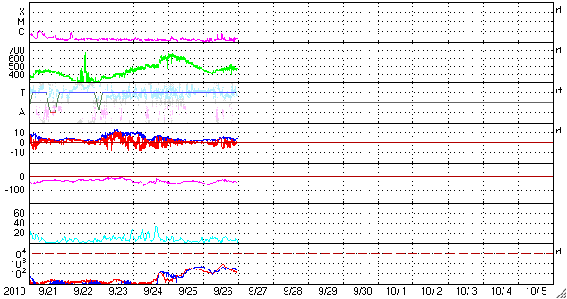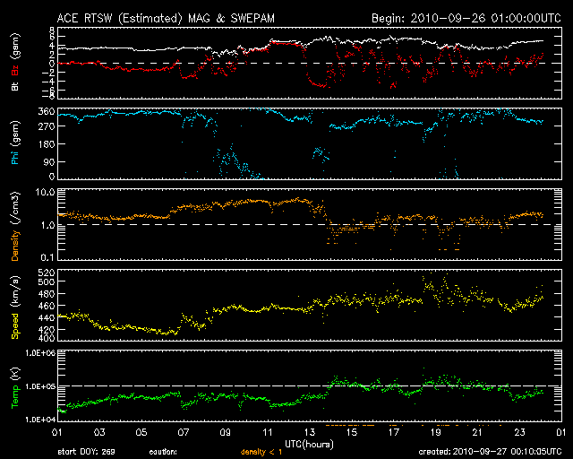 2010/ 9/27 09:11 更新 やや高速の太陽風(460km/秒)が続いています。1109黒点群は小さなフレアを起こしています。 担当 篠原 太陽風の速度は、昨日の昼頃に400km/秒まで下がりましたが、 すぐに460km/秒とやや高速の状態に戻り、現在まで続いています。 磁場強度は、5nTと平均的なレベルです。 太陽風の磁場が南北に振れた時間帯があり、 そこで、小規模のオーロラ活動が発生しています。 太陽風磁場の南北の振れは収まりつつあり、 オーロラの活動も、この後は弱まっていくと思われます。 太陽風には、高速風領域の影響が残っているのかもしれません。 SOHO EIT195を見ると、発生源のコロナホールは西の端に近づいて、 すっかり見えなくなってしまいました。 太陽風への影響も、長くは続かないでしょう。 一旦落ち着いて、その後、明後日くらいに もうひとつの淡いコロナホールの影響が見られるかもしれません。 太陽風の変動は小規模でしょう。 1109黒点群は、再び黒点の数を増やし、 右から左へ一列の黒点の並びが復活しています。 Bクラスの小さなフレアも多数発生させていて、活動度は少し上がっているようです。 小規模フレアに発達することも考えられるので、注目してください。 SOHO衛星のEIT195カメラによる太陽コロナの様子 (c) SOHO (ESA & NASA) ![]() SOHO衛星による太陽の可視光写真。マウスの矢印を写真に重ねると、黒点番号付きの写真に切り替わります。 (c) SOHO (ESA & NASA) ![]() ACEが観測した太陽風の磁場(1番上の枠、白線は全体の強度、赤線は南北成分) および、太陽風の密度(3番目の橙線)、速度(4番目の黄線) (c) NOAA/SWPC ![]() リアルタイムAE指数 下段のAEグラフの値が高くなると、オーロラ活動が活発化しています。 (c) 京都大学, NICT ![]() 27日の太陽周期に合わせたデータプロット 太陽が同じ面を地球に向けていた27日前の変化から、今後を予想することができます。 (c) 作図:宇宙天気ニュース