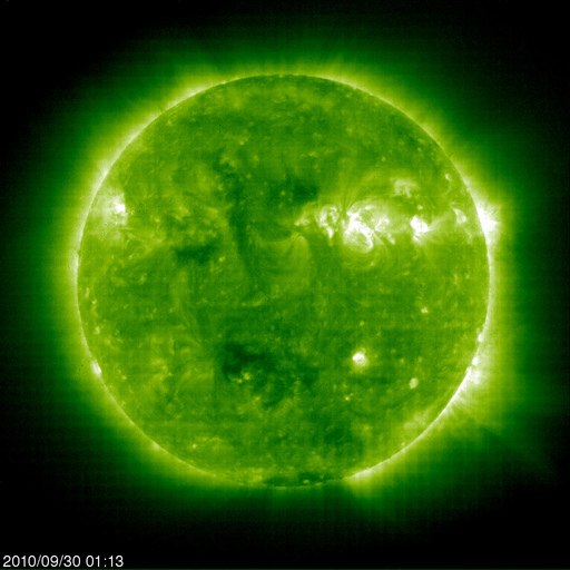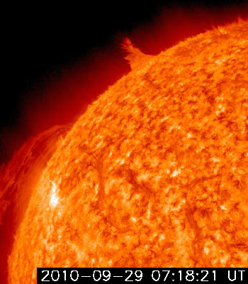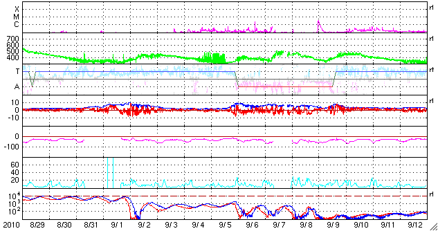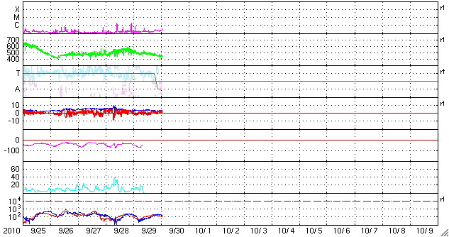 2010/ 9/30 10:24 更新 フィラメントの噴出が発生しました。太陽風の速度は下がり、現在は440km/秒です。 担当 篠原 昨日の夕方、29日17時(世界時29日8時)頃に、 太陽の北東部(左上側)でフィラメントの噴出現象が発生しました。 SDO AIA304による動画を掲載します。 動画では、フィラメントは黒い筋の様に見えています。 太陽の上空に浮かぶ、コロナの中としては温度の低いプラズマの帯です。 これが、急激に上空へ向かって飛び出していく様子が見られます。 この噴出によって、CME(太陽ガスの放出現象)も発生しているのではないかと思うのですが、 STEREO Behindの画像では、はっきりとは分かりませんでした。 地球からは斜め方向でもあり、大きな影響はなさそうです。 太陽では、2つのCクラスフレアに続く活動は特になく、 1110黒点群のこれ以上の発達も見られませんでした。 一段落というところでしょうか。 そして、太陽の北半球の東端(左端)に、新しい黒点が出現しています。 1111黒点群と番号が付けられています。 この黒点番号は、10000を省略して下4桁のみ表記しています。 従って、この新しい黒点群の正確な番号は、11111黒点群です。 ちなみに、10000番の黒点が出現したのは、宇宙天気ニュースの始まる前、 2002年6月のことです。 例えば、こちらのページをご覧ください。 太陽風は、500km/秒台を割り、440km/秒と普通の速度に戻りつつあります。 コロナホールによる速度の高まり全体が、前周期よりも1日ほど早まっていた様です。 磁場の南北成分は、北寄りか、南を向いても振幅は小さく、 オーロラ活動は、AE指数で200〜300nTと小規模のものが発生した程度です。 この後の展開ですが、SOHO EIT195を見ると、 太陽の南半球側に小さなコロナホールがあります。 次は、ここからの影響が地球へやって来ると思われます。 27日周期の図で、9月6日から10日にかけて太陽風は小規模ですが高速風になっています。 この回帰です。 10月3日くらいに始まりそうです。 太陽の北東部で発生したフィラメントの噴出現象。SDO AIA304撮影。 (c) SDO (NASA)、動画加工 : 宇宙天気ニュース ![]() SOHO衛星のEIT195カメラによる太陽コロナの様子 (c) SOHO (ESA & NASA) ![]() SOHO衛星による太陽の可視光写真。マウスの矢印を写真に重ねると、黒点番号付きの写真に切り替わります。 (c) SOHO (ESA & NASA) ![]() GOES衛星の太陽X線データ (c) NOAA/SWPC ![]() ACEが観測した太陽風の磁場(1番上の枠、白線は全体の強度、赤線は南北成分) および、太陽風の密度(3番目の橙線)、速度(4番目の黄線) (c) NOAA/SWPC ![]() リアルタイムAE指数 下段のAEグラフの値が高くなると、オーロラ活動が活発化しています。 (c) 京都大学, NICT ![]() 27日の太陽周期に合わせたデータプロット 太陽が同じ面を地球に向けていた27日前の変化から、今後を予想することができます。 (c) 作図:宇宙天気ニュース