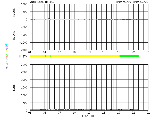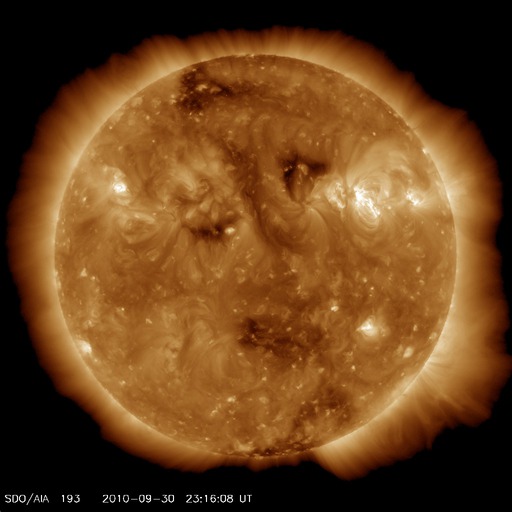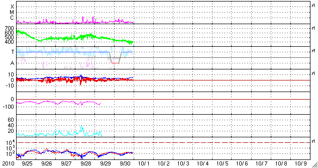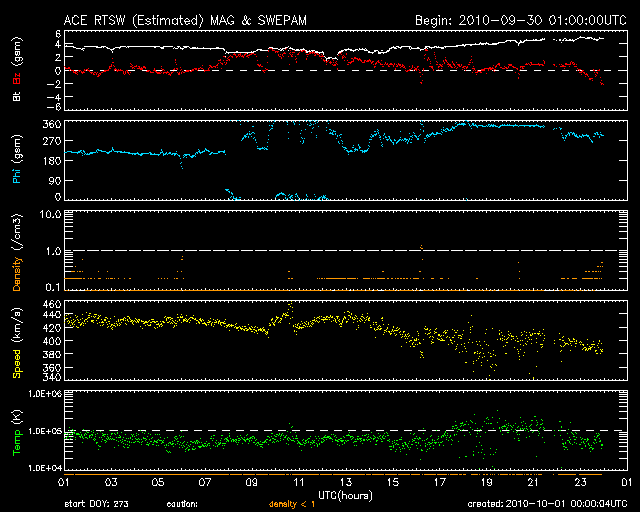 2010/10/ 1 09:00 更新 太陽風は平均的な速度に戻りました。太陽も概ね静穏です。 担当 篠原 太陽風の速度(ACEの黄色線)は、400km/秒まで下がり、平均的な速度に戻っています。 磁場強度は、4nT前後で、こちらも平均的なレベルです。 今日、明日と、このまま落ち着いた状態が続くと思われます。 磁気圏のオーロラ活動は、低調で、AE指数は全く変化していません。 これは、太陽風磁場の南北成分(ACEの赤線)が、 北寄りを保っている(プラスの方向)ためだと思われます。 太陽風磁場の方向は、磁気圏へのエネルギー流入のスイッチになっています。 磁場が南の方向(赤線がマイナスの方向)を向くと、 太陽風から磁気圏へエネルギーが効率的に流れ込むようになり、 オーロラなどの活動を強めます。 逆に北を向くと(赤線がプラス)、エネルギー流入のスイッチが切れて、 オーロラは今日のAE指数の図のように、静かになるのです。 今日はSDOのAIA193の太陽コロナ写真を掲載しています。 太陽の中心を南北方向に小さなコロナホールがいくつか並んでいます。 これらの影響が、明後日あたりから地球にやって来る可能性があります。 27日周期の図の前周期のグラフで、 9月6〜10日にかけて速度や磁場の小規模の変化が起きています。 これらの変動の回帰です。 今回の変化も規模は小さいと思われますが、 来週は、太陽風やオーロラの活動にいろいろと変化が見られるかもしれません。 太陽は、Bクラスの小さなフレアがいくつか発生しています。 SDOの動画などを見ていると、太陽の西側に進んだ1109黒点群や1110黒点群、 また、西の端に隠れていった活動領域などで小さな変化が起きているようです。 活動としてはそれほど強そうでもなく、 今後、Cクラスのフレアに発展するかどうかというところでしょう。 SDO衛星のAIA193カメラによる太陽コロナの様子 (c) SDO (NASA) ![]() SOHO衛星による太陽の可視光写真。マウスの矢印を写真に重ねると、黒点番号付きの写真に切り替わります。 (c) SOHO (ESA & NASA) ![]() ACEが観測した太陽風の磁場(1番上の枠、白線は全体の強度、赤線は南北成分) および、太陽風の密度(3番目の橙線)、速度(4番目の黄線) (c) NOAA/SWPC ![]() リアルタイムAE指数 下段のAEグラフの値が高くなると、オーロラ活動が活発化しています。 (c) 京都大学, NICT ![]() 27日の太陽周期に合わせたデータプロット 太陽が同じ面を地球に向けていた27日前の変化から、今後を予想することができます。 (c) 作図:宇宙天気ニュース