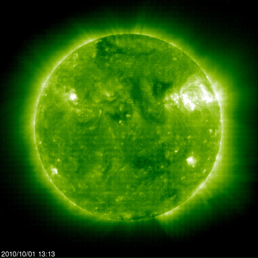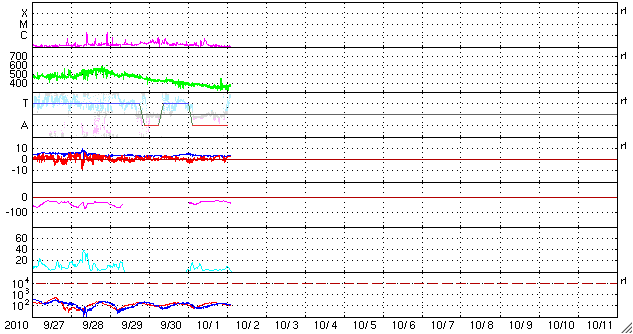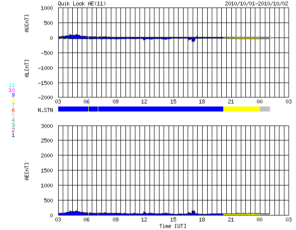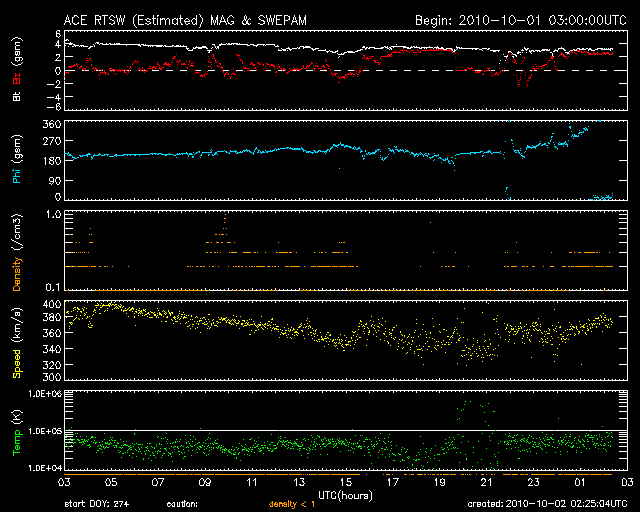 2010/10/ 2 11:26 更新 穏やかな太陽風が続き、オーロラ活動は低調です。太陽も静かです。 担当 篠原 太陽風の速度は、昨日のニュース以降、400km/秒から360km/秒ほどに下がり、 今朝に入って少し上がって380km/秒となっています。 やや遅めの状態が続いています。 磁場強度も、4nTから3nTとやや弱めで推移していて、 太陽風は全体的に穏やかです。 このため、磁気圏のオーロラ活動もとても静かです。 AE指数のグラフは、ほとんど変化していません。 これは、太陽風の速度が低めであるとともに、 磁場の南北成分(ACEの赤線)が、 0nTよりもプラス側(北向き)を保っているということが 効いていると思います。 今日辺りまでは、このまま穏やかに推移するでしょう。 明日以降は、弱いコロナホールの影響が、 太陽風の速度や磁場に現われる可能性があります。 前周期は、最高で500km/秒に上がった程度の変化でした。 今回も規模としては同じくらいでしょう。 太陽は、1109黒点群だけが目立って、 1110群、1111群はほとんど見えなくなっています。 フレア活動は、西端(右端)の1110群がB5の小さなフレアを起こした程度で、 全体的には穏やかです。 SOHO衛星のEIT195カメラによる太陽コロナの様子 (c) SOHO (ESA & NASA) ![]() SOHO衛星による太陽の可視光写真。マウスの矢印を写真に重ねると、黒点番号付きの写真に切り替わります。 (c) SOHO (ESA & NASA) ![]() ACEが観測した太陽風の磁場(1番上の枠、白線は全体の強度、赤線は南北成分) および、太陽風の密度(3番目の橙線)、速度(4番目の黄線) (c) NOAA/SWPC ![]() リアルタイムAE指数 下段のAEグラフの値が高くなると、オーロラ活動が活発化しています。 (c) 京都大学, NICT ![]() 27日の太陽周期に合わせたデータプロット 太陽が同じ面を地球に向けていた27日前の変化から、今後を予想することができます。 (c) 作図:宇宙天気ニュース