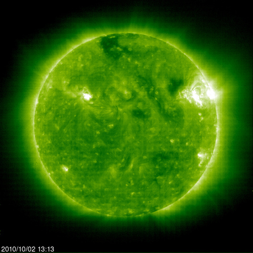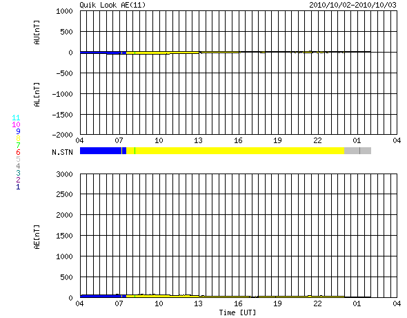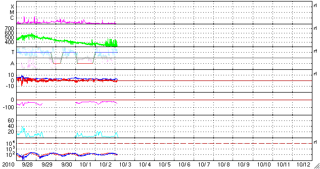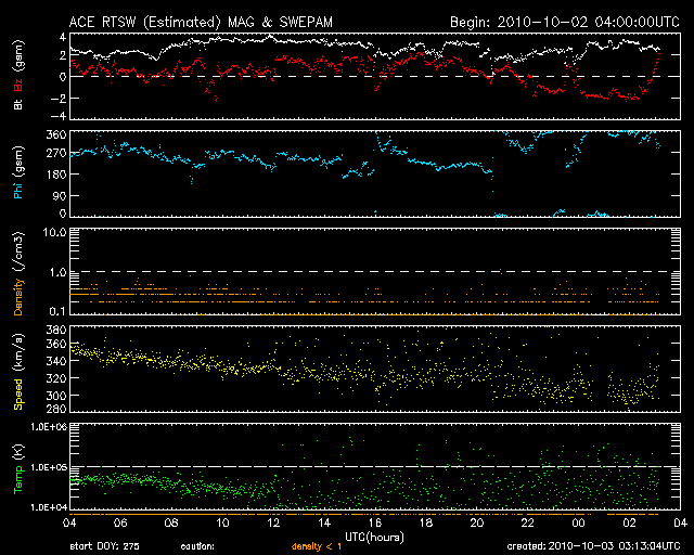 2010/10/ 3 12:12 更新 太陽風はとても遅くなり、オーロラ活動も静穏です。 担当 篠原 太陽風の速度は更に低下して、300km/秒ほどになっています。 かなり遅めの速度です。 磁場強度も3nT前後と弱めで推移しています。 コロナホールの影響はまだ始まっていません。 27日周期の図を見ると、 前周期の速度変化のタイミングは、これからやって来るくらいです これから4〜5日程度、太陽風の小規模の変化に注意してください。 磁気圏の活動も、現在はとても静かです。 AE指数は全く変化していません。 太陽も概ね静穏です。 1109黒点群(右側の大きな黒点)が、B5の小さなフレアを起こしていますが、 X線の目立った変化はこれだけです。 左側の1111黒点群は、昨日よりも数が少し大きく見えています。 更に発達するようだと、注目です。 SOHO衛星のEIT195カメラによる太陽コロナの様子 (c) SOHO (ESA & NASA) ![]() SOHO衛星による太陽の可視光写真。マウスの矢印を写真に重ねると、黒点番号付きの写真に切り替わります。 (c) SOHO (ESA & NASA) ![]() ACEが観測した太陽風の磁場(1番上の枠、白線は全体の強度、赤線は南北成分) および、太陽風の密度(3番目の橙線)、速度(4番目の黄線) (c) NOAA/SWPC ![]() リアルタイムAE指数 下段のAEグラフの値が高くなると、オーロラ活動が活発化しています。 (c) 京都大学, NICT ![]() 27日の太陽周期に合わせたデータプロット 太陽が同じ面を地球に向けていた27日前の変化から、今後を予想することができます。 (c) 作図:宇宙天気ニュース