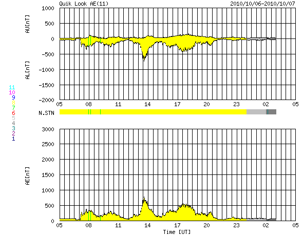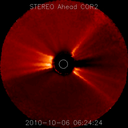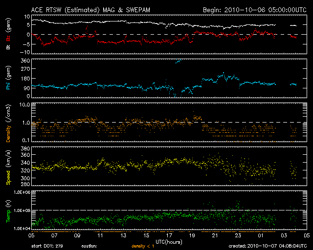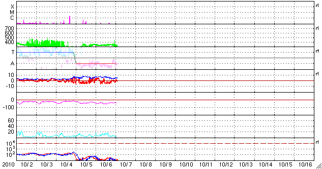 2010/10/ 7 13:08 更新 太陽風は低速ですが、南向き磁場によりオーロラが活発化しました。CMEが発生しています。 担当 篠原 昨日は、太陽風磁場が半日にわたって-5nTほどの南向きになりました。 太陽風の速度は320km/秒と低速だったのですが、 南向き磁場の影響で、やや活発なオーロラ活動が発生しました。 AE指数では、300nTから700nTに達する中小規模の変化が観測されています。 アラスカのライブカメラにとって、好適な時間帯だったため、 きれいなオーロラを楽しむことができました。 現在の太陽風は、速度は320km/秒と低速のままです。 磁場強度は、5nTと平均的なレベルですが、昨日よりはやや弱まっています。 磁場の南北成分は、0nT付近を変化しています。 このため、現在のオーロラ活動は静穏です。 昨日、太陽の北東部でフィラメントの噴出が発生した様です。 その影響でCME(太陽ガスの放出現象)が発生しています。 SOHOのLASCO C3と、STEREO AheadのCOR2による動画を掲載します。 SOHOでは、太陽の上半分を包むように淡いガスが広がっていますが、 STEREO Aheadでは、地球のある左側に向かって激しくガスが飛び出しています。 この様子から、CMEの影響は地球へやって来る可能性があります。 フレアではないため、速度はそれほど高くないだろうと思います。 4日後くらいと考えて、10月10日前後に太陽風に乱れが発生するかもしれません。 磁場の強まりがやって来ると、大きく南向きになって、 磁気嵐など活発な変化を発生させる可能性があります。 太陽は無黒点です。 X線の変化も特になく、太陽は穏やかです。 SOHO LASCO C3カメラ。右上に向かって、CMEのガスが広がっています。 (c) SOHO (ESA & NASA) ![]() STEREO Aheadによる、CMEの噴出の様子。左が地球の方向。 (c) STEREO (NASA) ![]() SOHO衛星のEIT195カメラによる太陽コロナの様子 (c) SOHO (ESA & NASA) ![]() SOHO衛星による太陽の可視光写真。マウスの矢印を写真に重ねると、黒点番号付きの写真に切り替わります。 (c) SOHO (ESA & NASA) ![]() ACEが観測した太陽風の磁場(1番上の枠、白線は全体の強度、赤線は南北成分) および、太陽風の密度(3番目の橙線)、速度(4番目の黄線) (c) NOAA/SWPC ![]() リアルタイムAE指数 下段のAEグラフの値が高くなると、オーロラ活動が活発化しています。 (c) 京都大学, NICT ![]() 27日の太陽周期に合わせたデータプロット 太陽が同じ面を地球に向けていた27日前の変化から、今後を予想することができます。 (c) 作図:宇宙天気ニュース