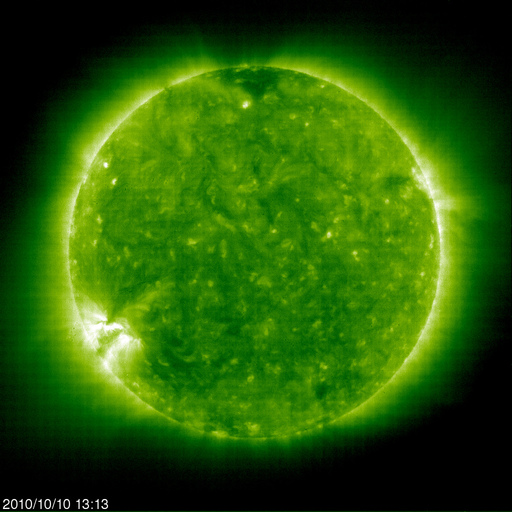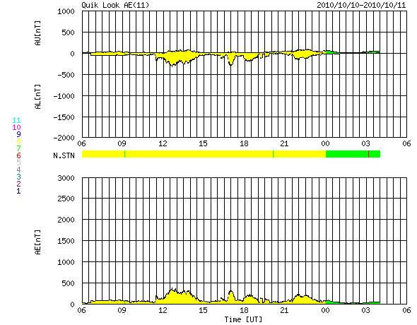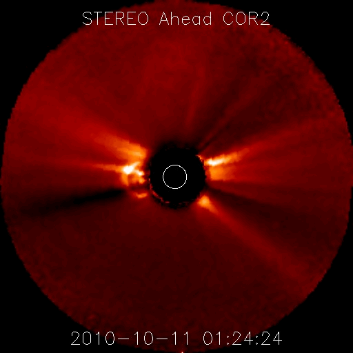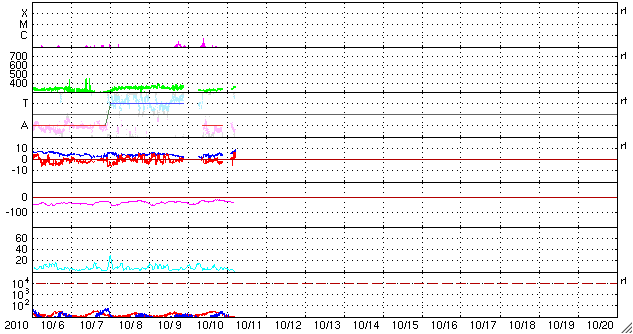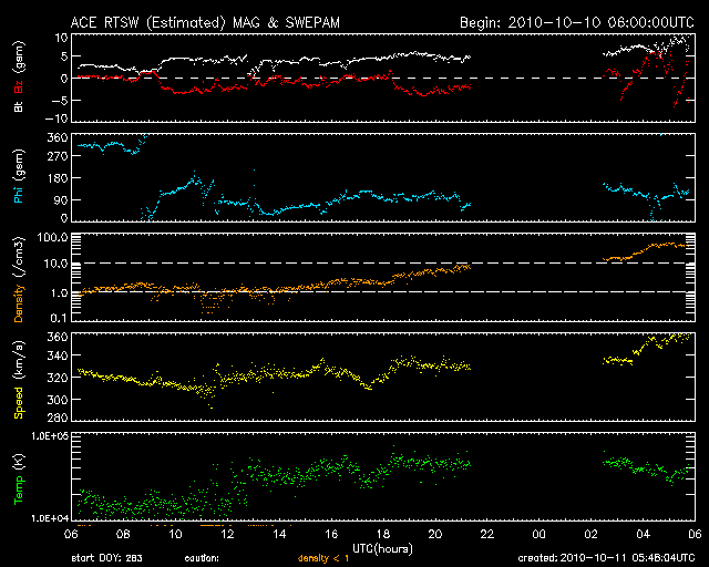 2010/10/11 14:48 更新 太陽風は低速ですが、CMEの影響が来つつあるかもしれません。 担当 篠原 太陽風に変化が発生しています。 プラズマの密度が、1個/cm^3から40個/cm^3へ増えています。 磁場強度も8nTへ強まり、速度は320km/秒から360km/秒へと小幅の上昇を示しています。 6日に発生したCMEの影響が到来しつつあるのかもしれません。 5日ほど経過していますから、速度が大きく上がることはないでしょう。 それでも、磁場強度が更に強まって、南北成分が南を大きく向くようになると、 オーロラの活動が活発化することが予想されます。 大きな乱れにはならないですが、オーロラの観望にはチャンスでしょう。 この後のACEのデータに注目してください。 ここまでの磁気圏活動は、概ね静穏です。 AE指数は、300nTほどの小規模の活動が見られる程度です。 太陽では、11日1時(世界時10日16時頃)に、 太陽の南東部、1112黒点群の少し北側でフィラメントの噴出が発生しました。 それによるCME(太陽ガスの放出現象)がSTEREO Aheadで観測されています。 地球に対して斜め方向の噴出なので、大きな影響は来ないでしょう。 太陽は、1112黒点群の小さな黒点が見えるだけです。 1112群はB5.5などの小さなフレアを起こしていますが、 特に活発化している様子は見られません。 基本的には穏やかに推移するでしょう。 STEREO Aheadによる、CMEの様子。 (c) STEREO (NASA)、動画加工 : 宇宙天気ニュース ![]() SOHO衛星のEIT195カメラによる太陽コロナの様子 (c) SOHO (ESA & NASA) ![]() SOHO衛星による太陽の可視光写真。マウスの矢印を写真に重ねると、黒点番号付きの写真に切り替わります。 (c) SOHO (ESA & NASA) ![]() ACEが観測した太陽風の磁場(1番上の枠、白線は全体の強度、赤線は南北成分) および、太陽風の密度(3番目の橙線)、速度(4番目の黄線) (c) NOAA/SWPC ![]() リアルタイムAE指数 下段のAEグラフの値が高くなると、オーロラ活動が活発化しています。 (c) 京都大学, NICT ![]() 27日の太陽周期に合わせたデータプロット 太陽が同じ面を地球に向けていた27日前の変化から、今後を予想することができます。 (c) 作図:宇宙天気ニュース