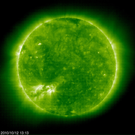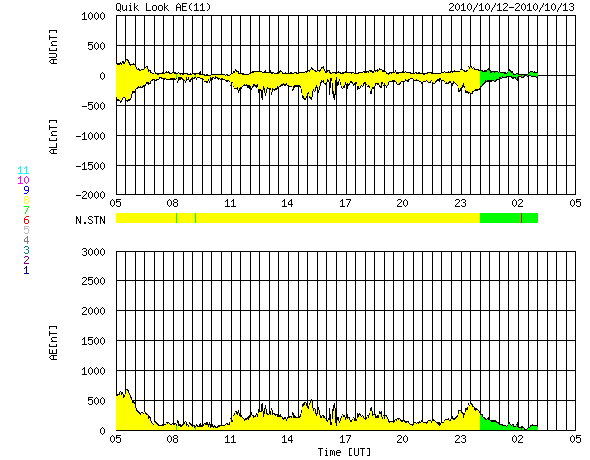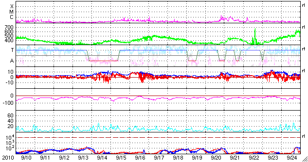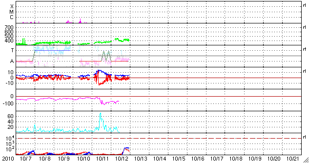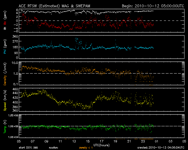 2010/10/13 13:06 更新 太陽風は平均的な状態に戻りました。オーロラ活動は発生していますが、磁気嵐は終わりつつあります。 担当 篠原 CMEによる磁場のかたまりは通り過ぎ、穏やかな太陽風に戻っています。 太陽風の速度は400km/秒付近を上下していて、平均的なレベルです。 磁場強度も、5nTと通常の値で安定しています。 磁場の南北成分は、南寄りの傾向が続いていて、 -3nTほどの南向きが長時間保たれています。 このため、AE指数で300〜500nTほどの小規模のオーロラ活動が連続的に発生しています。 一方、Dst指数を参照すると、昨日発生していた磁気嵐は終わりつつあるようです。 太陽風は、この後は、しばらく穏やかな状態が続くでしょう。 SOHO EIT195のコロナ写真では、今のところ目立ったコロナホールは見られません。 27日前の前周期の今頃は、太陽の東端にコロナホールが姿を現していたのですが、 現在の太陽にはその姿は見えません。 コロナホールの分布は変化しているようで、 今後の太陽風の推移も前周期とは違って来るでしょう。 27日周期の図では、前周期は9月21日から太陽風の変動が始まりました。 今回はその始まりが遅れることになりそうです。 放射線帯の高エネルギー電子は、今回の擾乱では大きな増加にはなりませんでした。 多少増加していますが、警戒レベルよりもずっと下の数値です。 この後も、穏やかな状態が続くでしょう。 太陽は、南東(左下)に1112黒点群が小さな姿を見せているだけです。 1112群は活動度も低く、X線のグラフは全く変化していません。 SOHO衛星のEIT195カメラによる太陽コロナの様子 (c) SOHO (ESA & NASA) ![]() SOHO衛星による太陽の可視光写真。マウスの矢印を写真に重ねると、黒点番号付きの写真に切り替わります。 (c) SOHO (ESA & NASA) ![]() ACEが観測した太陽風の磁場(1番上の枠、白線は全体の強度、赤線は南北成分) および、太陽風の密度(3番目の橙線)、速度(4番目の黄線) (c) NOAA/SWPC ![]() リアルタイムAE指数 下段のAEグラフの値が高くなると、オーロラ活動が活発化しています。 (c) 京都大学, NICT ![]() 27日の太陽周期に合わせたデータプロット 太陽が同じ面を地球に向けていた27日前の変化から、今後を予想することができます。 (c) 作図:宇宙天気ニュース