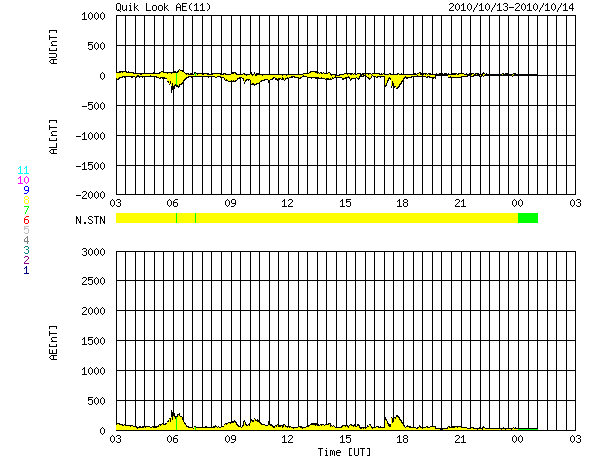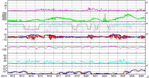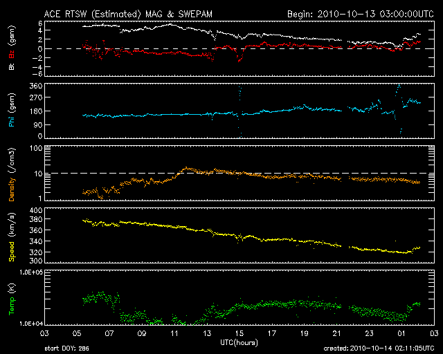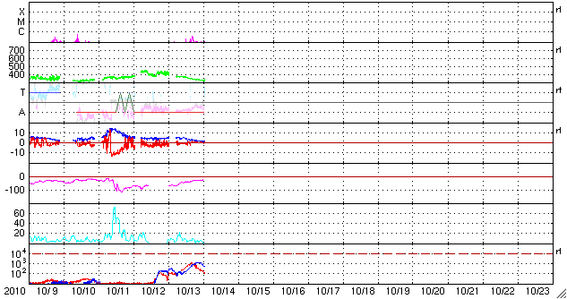 2010/10/14 11:11 更新 太陽風は穏やかです。1113黒点群が出現しました。Live!オーロラの写真を紹介します。 担当 篠原 このニュースでもよく紹介しているLive! オーロラの古賀さんより、 10月9日にアラスカのライブカメラで撮影されたオーロラの写真をいただきました。 とても見事な写真なので、少し大きめのサイズで掲載します。 (元のファイルは更に一回り大きいのですが、ニュースに入らなくなってしまうので・・・) Live! オーロラのライブ画像を追いかけていると、太陽風の乱れは小さめでも、 時間帯が良ければかなり華やかなオーロラを見ることができます。 撮影技術などの見えないところで、様々な工夫が重ねられているのだろうと思います。 掲載の写真は、日本時間の18時半、現地は午前1時半です。 ライブ観望は、日本時間の夕方をはさんで、午後から夜にかけてというのが狙い目のようです。 (リアルタイム画像に見とれていて、夕食に行きそびれるということを何度かしてしまいました) これから来春まで、存分にお楽しみ下さい。 太陽では、東端に新しい黒点が顔を出しています。 1113黒点群と番号が付いています。 活動が多少発生していて、X線のグラフにBクラスの変動を起こしています。 現時点では、これ以上特に大きな活動につながることはなさそうです。 太陽風の速度は320km/秒へ下がっていき、低速状態になっています。 磁場強度も、5nTから2nTへと弱まり、 速度・磁場ともに太陽風は穏やかになっています。 このため、磁気圏活動も穏やかで、 AE指数には小さな変化がちらちら見られる程度です。 静かな太陽風は、しばらく続きそうです。 現在の太陽コロナには、目立ったコロナホールは見えていません。 SOHO EIT195の北半球の東端付近に、△の形をしたコロナホールが見えています。 この部分の影響は、まだ6〜7日程度先になります。 それまでは、多少の変動はあっても、基本的には静かな宇宙天気になりそうです。 放射線帯の高エネルギー電子は、昨日よりももう一段増加しましたが、 1000のレベルに達した程度です。 これ以上の増加はないでしょう。 アラスカで撮影された、10月9日のオーロラの様子。Live! オーロラより。 (c) Live! オーロラ ![]() SOHO衛星のEIT195カメラによる太陽コロナの様子 (c) SOHO (ESA & NASA) ![]() SOHO衛星による太陽の可視光写真。マウスの矢印を写真に重ねると、黒点番号付きの写真に切り替わります。 (c) SOHO (ESA & NASA) ![]() GOES衛星の太陽X線データ (c) NOAA/SWPC ![]() ACEが観測した太陽風の磁場(1番上の枠、白線は全体の強度、赤線は南北成分) および、太陽風の密度(3番目の橙線)、速度(4番目の黄線) (c) NOAA/SWPC ![]() リアルタイムAE指数 下段のAEグラフの値が高くなると、オーロラ活動が活発化しています。 (c) 京都大学, NICT ![]() 27日の太陽周期に合わせたデータプロット 太陽が同じ面を地球に向けていた27日前の変化から、今後を予想することができます。 (c) 作図:宇宙天気ニュース