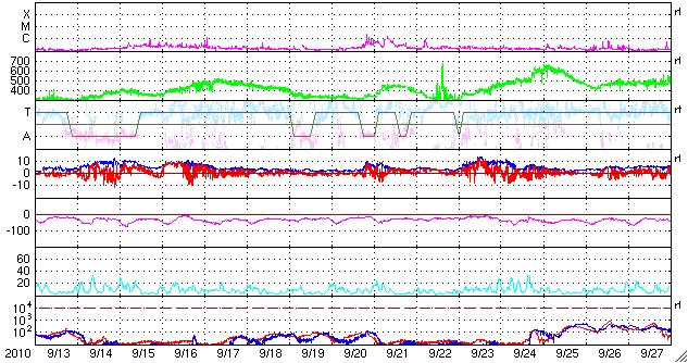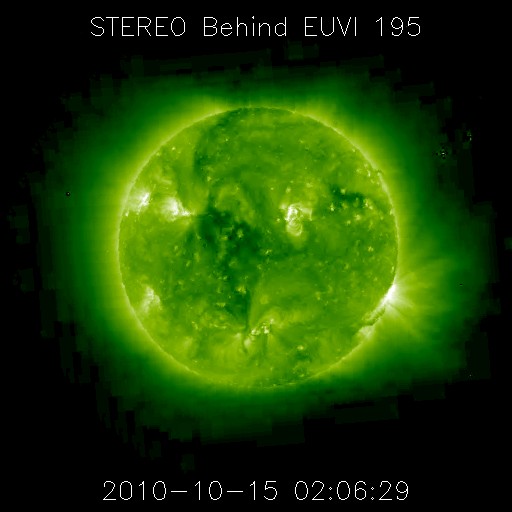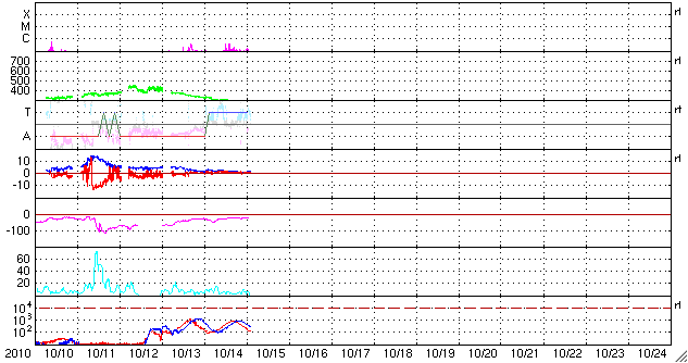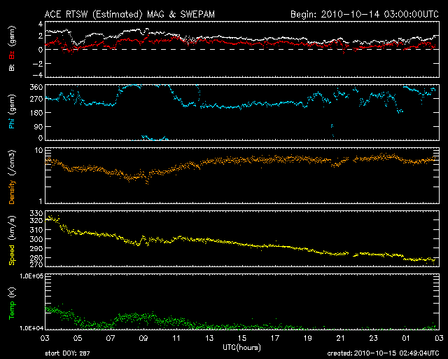 2010/10/15 11:49 更新 太陽の黒点が増えています。太陽風はとても遅い風で、オーロラ活動は低調です。 担当 篠原 太陽の黒点が、少しにぎやかになっています。 先ず、中央部南側の1112黒点群は、4つの黒点が上下左右に並び、 まるで南十字星の様な見え方をしています。 そして、そこから右側に行くと、小さな黒点がひとつ、 これは1114黒点群と番号が付いています。 (右に行き過ぎると、いつも見えているエラーデータの黒い点に当たります) 逆に、1112群から左に行くと、太陽の東端から大きな黒点がちょうど顔を出しています。 恐らく、27日前に1108黒点群と呼ばれていた領域の回帰だと思います。 最後に、北東端の黒点は1113黒点群です。 昨日よりよく見えるようになりましたが、形に特に変化はないようです。 黒点の周りをぐるっと白斑が囲んでいます。 X線データでは、Bクラスの小さな活動がいくらか発生しています。 中央部の1112群で起きているようです。 昨日同様、規模は小さいままで、特に活発化の気配は見られません。 太陽風は、どんどん速度が下がって、280km/秒とかなり遅い風になっています。 磁場強度も2nTを割って、1nT近くまで弱まっています。 とても穏やかな太陽風です。 従って、磁気圏も静穏で、AE指数は全く変化していません。 SOHO EIT195では、北半球東側のコロナホールが、昨日よりいくらか見やすくなっていますが、 淡い状態のままで、規模は弱い様子です。 高速風としての影響は、小さいものとなりそうです。 STEREO Behindを見ると(今日の1枚目の写真)、 1113黒点群(この写真では、太陽の中心から右寄りに明るく見えている)の向こう側には、 赤道付近に大きなコロナホールが広がっています。 しばらく先ですが、この領域からはまとまった規模の高速風を受けることになりそうです。 STEREO Behindによる太陽コロナ。地球よりも、5日ほど先の位置から見ています。 (c) NASA ![]() SOHO衛星のEIT195カメラによる太陽コロナの様子 (c) SOHO (ESA & NASA) ![]() SOHO衛星による太陽の可視光写真。マウスの矢印を写真に重ねると、黒点番号付きの写真に切り替わります。 (c) SOHO (ESA & NASA) ![]() GOES衛星の太陽X線データ (c) NOAA/SWPC ![]() ACEが観測した太陽風の磁場(1番上の枠、白線は全体の強度、赤線は南北成分) および、太陽風の密度(3番目の橙線)、速度(4番目の黄線) (c) NOAA/SWPC ![]() リアルタイムAE指数 下段のAEグラフの値が高くなると、オーロラ活動が活発化しています。 (c) 京都大学, NICT ![]() 27日の太陽周期に合わせたデータプロット 太陽が同じ面を地球に向けていた27日前の変化から、今後を予想することができます。 (c) 作図:宇宙天気ニュース