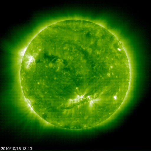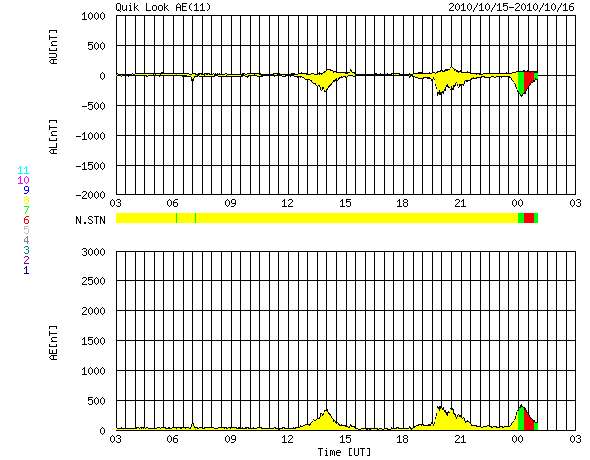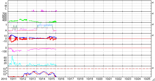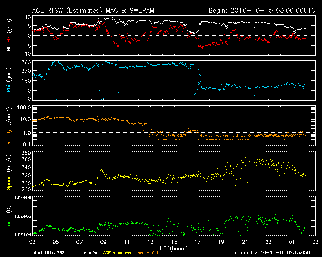 2010/10/16 11:14 更新 低速の穏やかな太陽風が続いています。太陽も穏やかです。 担当 篠原 太陽風の速度は、現在は340km/秒と、 昨日の280km/秒よりは上がりましたが、低速の状態が続いています。 磁場強度は回復して、一時的に10nT近くまで強まりもしていますが、 現在は5nT前後にある様です。 磁気圏も概ね静穏で、太陽風磁場の南向きに対応して、 小規模のオーロラ活動が発生している程度です。 穏やかな状態は、この後も続くでしょう。 SOHO EIT195の太陽コロナには、北東部(左上)に淡いコロナホールが見えていて、 5日後くらいに、太陽風に弱い影響をもたらすかもしれません。 むしろ、現在注目されるのは、太陽の中央から南寄りの明るく見えている領域 (可視光で1112黒点群の付近)に、 東西(横方向)に細長く伸びているダークフィラメントです。 (SOHO EIT195でも、薄暗い帯の様に見えています) このプラズマのかたまりが、フィラメント噴出となって噴き出すと、 ちょうど地球の正面なので、今後の太陽風に乱れを起こし、 11日に見られたような磁気嵐をもたらす可能性があります。 いつ噴出するかは分かりませんので、このまま平穏に4日ほど過ぎてしまえば、 以降は、地球への影響はないでしょう。 太陽は、南東(左下)の黒点に1115黒点群と番号が付きました。 一方、昨日現れた西側の1114黒点群は、今日は見えなくなっています。 X線グラフでは、Bクラスの小さな変化は見られますが、全体的には穏やかです。 SOHO衛星のEIT195カメラによる太陽コロナの様子 (c) SOHO (ESA & NASA) ![]() SOHO衛星による太陽の可視光写真。マウスの矢印を写真に重ねると、黒点番号付きの写真に切り替わります。 (c) SOHO (ESA & NASA) ![]() ACEが観測した太陽風の磁場(1番上の枠、白線は全体の強度、赤線は南北成分) および、太陽風の密度(3番目の橙線)、速度(4番目の黄線) (c) NOAA/SWPC ![]() リアルタイムAE指数 下段のAEグラフの値が高くなると、オーロラ活動が活発化しています。 (c) 京都大学, NICT ![]() 27日の太陽周期に合わせたデータプロット 太陽が同じ面を地球に向けていた27日前の変化から、今後を予想することができます。 (c) 作図:宇宙天気ニュース