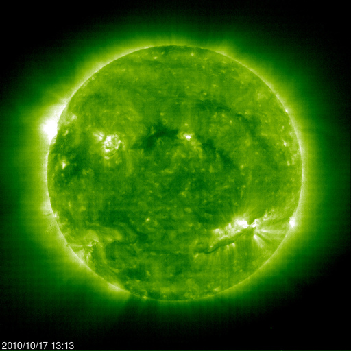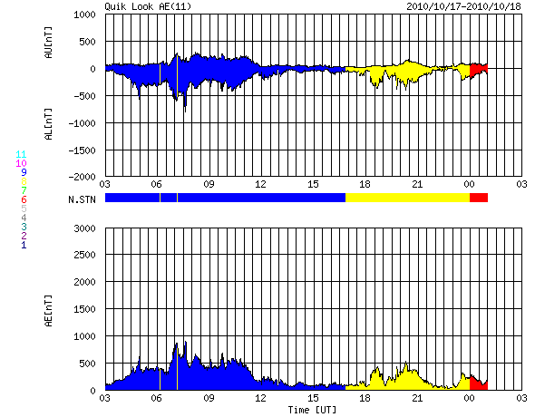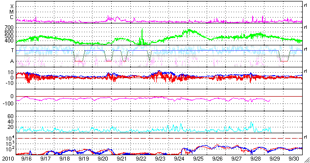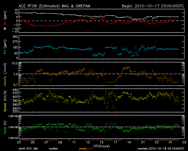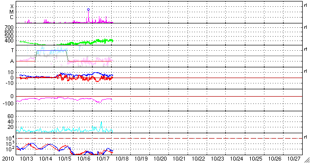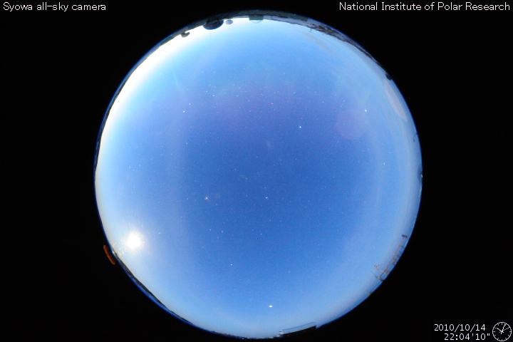 2010/10/18 11:16 更新 1112黒点群でCクラスのフレアが発生しています。太陽風磁場南向きの影響で、オーロラが活発化しました。 担当 篠原 1112黒点群は、やや活動度を増して、 17日18時(世界時17日9時)にC1.7、18日2時半(世界時17日17時半)にC1.6と、 2つの小規模フレアを起こしました。 その他にも、Bクラスのフレアをいくつも起こしています。 規模は小さなものばかりですが、X線グラフは久しぶりににぎわっています。 1112黒点群は、黒点の数も増えていて、これまでの4点から右に向かって広がっています。 引き続き、Mクラスの中規模フレアの発生などに注意して下さい。 また、太陽の中央部北寄りに、小さく1116黒点群が発生しています。 太陽風は、昨日の午後に-5nTの南向き磁場が5時間にわたって継続しました。 速度は400km/秒と平均的な速さです。 この影響で、磁気圏のオーロラ活動が活発化し、 AE指数で400nTから800nTほどの中規模の変動が発生しました。 北極域ではきれいなオーロラを見られたのではないでしょうか。 これまで紹介していた南極の昭和基地は、とうとう暗くならなくなった様で、 10月14日を最後に更新を停止しています。 記念に、今シーズン最後の一枚を掲載します。 (明るく見えているのは太陽ではなく、月でしょう) 更新再開は、来年の2月頃と思われます。 太陽風の磁場は、その後も南寄りを続けていて、 磁気圏では小規模の活動が続いています。 SOHO EIT195では、細長いコロナホールの先頭が、 地球への影響開始位置に近づいています。 27日周期の図を見ると、前周期は、 今日くらいからコロナホールの影響の第一波が来ていたのですが、 今周期はどうなるでしょうか。 コロナホールが弱まっていることで、速度の変化は小さく、到来も遅れるかもしれません。 しばらく注目してください。 一方、太陽の東端からは次のコロナホールが顔を出しています。 もう2日ほどするとはっきりと見えるようになるでしょう。 STEREO Behindで見ると、こちらは、赤道付近に南北に大きく広がっていて、 地球への影響もしっかりとやって来そうです。 南極の昭和基地、全天カメラの写真。2010年最後の一枚か? (c) 国立極地研究所 ![]() SOHO衛星のEIT195カメラによる太陽コロナの様子 (c) SOHO (ESA & NASA) ![]() SOHO衛星による太陽の可視光写真。マウスの矢印を写真に重ねると、黒点番号付きの写真に切り替わります。 (c) SOHO (ESA & NASA) ![]() GOES衛星の太陽X線データ (c) NOAA/SWPC ![]() ACEが観測した太陽風の磁場(1番上の枠、白線は全体の強度、赤線は南北成分) および、太陽風の密度(3番目の橙線)、速度(4番目の黄線) (c) NOAA/SWPC ![]() リアルタイムAE指数 下段のAEグラフの値が高くなると、オーロラ活動が活発化しています。 (c) 京都大学, NICT ![]() 27日の太陽周期に合わせたデータプロット 太陽が同じ面を地球に向けていた27日前の変化から、今後を予想することができます。 (c) 作図:宇宙天気ニュース