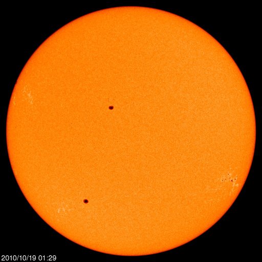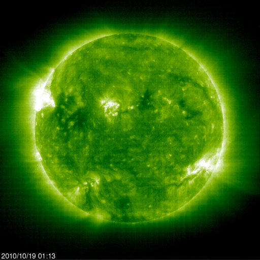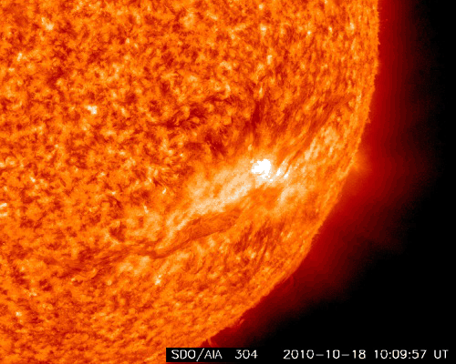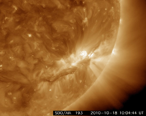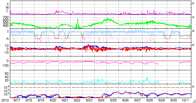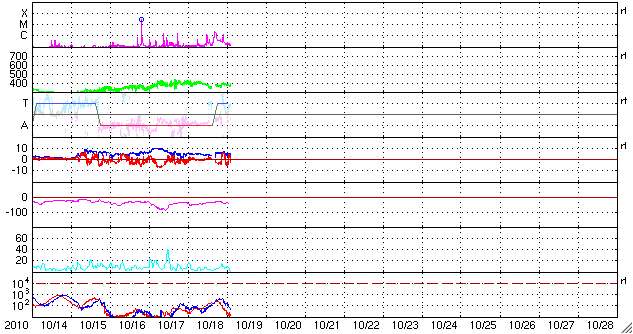2010/10/19 11:40 更新 1112黒点群でCクラスの小規模フレアが発生しました。太陽風と磁気圏は穏やかです。 担当 篠原 1112黒点群で、C1.2とC2.5のフレアが発生しました X線強度の変化としては、どちらも小規模のフレアでしたが、 SDO衛星の動画を見ると、広い1112黒点群をまたぐほどの雄大な現象だった様です。 SDO衛星のAIA 193とAIA304の動画を掲載します。 X線の変化が長時間型であることや、SDOの爆発の写真を見ていると、 CME(太陽ガスの放出現象)も発生していそうですが、 SOHOやSTEREOを見ると、今のところ目立った噴出は見られません。 フレアとしては、C1, 2と最低規模の現象なので、この程度のことなのかもしれません。 1012群の黒点は、細分化した状態を保っています。 活動も現状程度で、引き続き小規模フレアを起こすかもしれません。 また、太陽の東端から新しい活動領域が上がってきました。 しかし、白斑が見えるだけで黒点はないようです。 太陽風は、380km/秒とやや低速の風で安定しています。 伊庭強度も5nT付近で推移していて、穏やかです。 磁気圏も概ね静穏で、AE指数のグラフは300nTほどの変化が見える程度です。 現在の太陽風は、コロナホールの影響がいつ始まっても良い段階です。 SOHO EIT195では、コロナホールはだいぶ西側に進みました。 引き続き注目して下さい。 一方、次のコロナホールもSOHO EIT195に見えています。 太陽の中心から少し左側の薄暗い領域です。 もう1〜2日待つと、よりはっきりと姿を見ることができるでしょう。 SDO AIA 193によるフレアの様子 (c) NASA、動画加工 : 宇宙天気ニュース ![]() SDO AIA 304によるフレアの様子 (c) NASA、動画加工 : 宇宙天気ニュース ![]() SOHO衛星のEIT195カメラによる太陽コロナの様子 (c) SOHO (ESA & NASA) ![]() SOHO衛星による太陽の可視光写真。マウスの矢印を写真に重ねると、黒点番号付きの写真に切り替わります。 (c) SOHO (ESA & NASA) ![]() GOES衛星の太陽X線データ (c) NOAA/SWPC ![]() ACEが観測した太陽風の磁場(1番上の枠、白線は全体の強度、赤線は南北成分) および、太陽風の密度(3番目の橙線)、速度(4番目の黄線) (c) NOAA/SWPC ![]() リアルタイムAE指数 下段のAEグラフの値が高くなると、オーロラ活動が活発化しています。 (c) 京都大学, NICT ![]() 27日の太陽周期に合わせたデータプロット 太陽が同じ面を地球に向けていた27日前の変化から、今後を予想することができます。 (c) 作図:宇宙天気ニュース