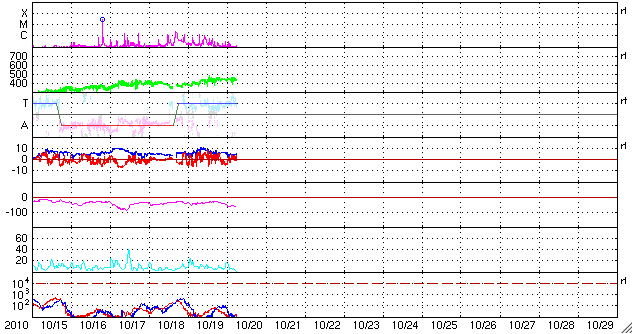 2010/10/20 15:38 更新 1112黒点群の小さな活動が続いています。太陽風は平均的な状態です。 担当 篠原 太陽では、西端(右端)の1112黒点群による小さなフレア活動が多発しています。 BクラスからC1にかけての小さなフレアによって、X線のグラフは針山の様です。 変動の規模は次第に下がっています。 1112群の活動度が下がっているのか、 西の端に近づいたために弱まって見えているだけの可能性もあります。 太陽では、東端から1117、1118黒点群と二つの黒点群が現れました。 掲載の可視光写真で東端に大きく見えているのは、1117黒点群です。 1118群は、その右下に微かに見えています。 太陽の中央線上には、北半球に1113黒点群、南半球に1115黒点群と、 同じような大きさで、ぽつんとひとつだけ見える黒点があります。 この様子を磁場写真で見てみると(今日の1枚目)、 北半球と南半球では磁場極性の順番が逆になるため、 北半球の1113群は、ぼんやり広がる白い領域と大きな黒丸、 南半球の1115黒点群では、ぼんやり黒が広がって大きな白丸と逆の見え方になっています。 なかなか面白い写真です。 太陽風は、速度がやや上がって、440km/秒となっています。 磁場強度も、初め10nTに上がっていましたが、現在は5nTほどに下がっています。 コロナホールの弱い影響がやって来ているのかもしれません。 この後も、この程度の速度がしばらく続く可能性があります。 SOHO EIT195では、東側のコロナホールがだいぶはっきり見えてきました。 1113黒点群、1117黒点群の2つの活動領域に挟まれるように、薄暗く広がっています。 4〜5日後くらいに、影響が地球へやって来そうです。 コロナホールの見え方から、しっかりと速度も上がりそうです。 今日は、更新がだいぶ遅くなりました。 これから2月までは、水曜日の更新はこの時間帯になる可能性があります。 SOHO衛星による太陽の磁場分布。1113黒点群の黒丸と1115黒点群の白丸が対称的です。 (c) SOHO (ESA & NASA) ![]() SOHO衛星のEIT195カメラによる太陽コロナの様子 (c) SOHO (ESA & NASA) ![]() SOHO衛星による太陽の可視光写真。マウスの矢印を写真に重ねると、黒点番号付きの写真に切り替わります。 (c) SOHO (ESA & NASA) ![]() GOES衛星の太陽X線データ (c) NOAA/SWPC ![]() ACEが観測した太陽風の磁場(1番上の枠、白線は全体の強度、赤線は南北成分) および、太陽風の密度(3番目の橙線)、速度(4番目の黄線) (c) NOAA/SWPC ![]() リアルタイムAE指数 下段のAEグラフの値が高くなると、オーロラ活動が活発化しています。 (c) 京都大学, NICT ![]() 27日の太陽周期に合わせたデータプロット 太陽が同じ面を地球に向けていた27日前の変化から、今後を予想することができます。 (c) 作図:宇宙天気ニュース