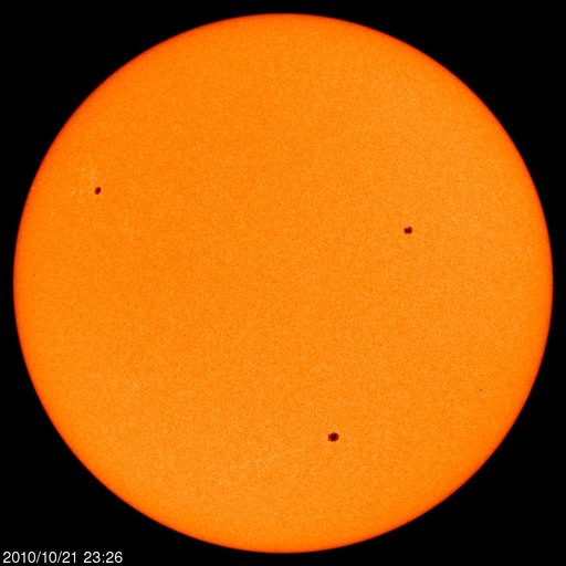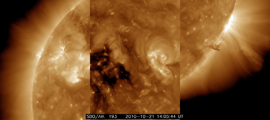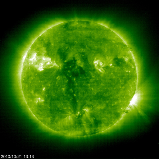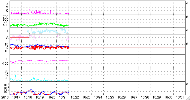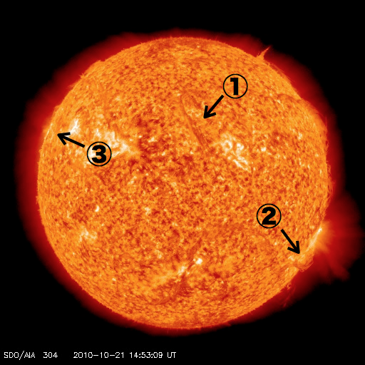 2010/10/22 12:06 更新 太陽風は平均的な状態で、磁気圏も穏やかです。太陽で爆発現象が3つ発生しています。 担当 篠原 太陽の3箇所で、爆発現象が連続して発生しています。 SDO衛星のAIA304、AIA193を使った動画を紹介します。 1枚目の写真は、発生箇所の紹介です。 中央部の?から、初めにフィラメントの噴出が発生します。 この写真では、フィラメントは黒い筋となって矢印の先にやや斜めに伸びています。 これに続いて、右下の?からもフィラメントの噴出。 しばらく前からここに大きく横たわっていたフィラメントがとうとう噴き出しました。 そして、?とほぼ同時に?ではフレアが発生したようです。 それに続いてコロナのガスが飛び出していきます。 この様子を、2枚目ではAIA304を使って太陽全体の動画を、 3枚目ではAIA193から3箇所を切り抜いて、詳細な動きを見て下さい。 地球の100倍の距離を持つ巨大な太陽面で、連係プレーが行われたのでしょうか。 これらの現象によって、CME(太陽ガスの放出現象)もまた、 3つの方向に発生している可能性がありますが、 まだデータが新しいため、詳しく分かりません。 その太陽ですが、フレア活動としては現在は静穏です。 X線データは小さなBクラスの変動が見られる程度です。 活動を続けていた1112黒点群は西に没し、 代わりに東からやや活動的な領域が上がって来ています。 黒点は、1113群、1115群、1117群と同じような大きさの黒点が、 まるで三すくみのように、にらみ合って見えます。 太陽風は、380km/秒と平均的な速度で安定しています。 磁場強度は、4nTからやや下がり気味。 磁気圏活動も概ね静穏です。 SOHO EIT195では、コロナホールが太陽の中心部に見えています。 それほど大きくはありませんが、この規模であれば、 高速風が3日程度は続きそうに思います。 明後日以降の太陽風の変化、そして、オーロラの活動に注目してください。 太陽の3箇所で爆発現象が発生しました。 (c) SDO (NASA)、書き込み : 宇宙天気ニュース ![]() SDO AIA 304による太陽全体の動画。 (c) SDO (NASA)、動画加工 : 宇宙天気ニュース ![]() SDO AIA 193による各部の詳細動画。 (c) SDO (NASA)、動画加工 : 宇宙天気ニュース ![]() SOHO衛星のEIT195カメラによる太陽コロナの様子 (c) SOHO (ESA & NASA) ![]() SOHO衛星による太陽の可視光写真。マウスの矢印を写真に重ねると、黒点番号付きの写真に切り替わります。 (c) SOHO (ESA & NASA) ![]() GOES衛星の太陽X線データ (c) NOAA/SWPC ![]() ACEが観測した太陽風の磁場(1番上の枠、白線は全体の強度、赤線は南北成分) および、太陽風の密度(3番目の橙線)、速度(4番目の黄線) (c) NOAA/SWPC ![]() リアルタイムAE指数 下段のAEグラフの値が高くなると、オーロラ活動が活発化しています。 (c) 京都大学, NICT ![]() 27日の太陽周期に合わせたデータプロット 太陽が同じ面を地球に向けていた27日前の変化から、今後を予想することができます。 (c) 作図:宇宙天気ニュース
