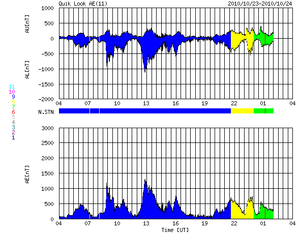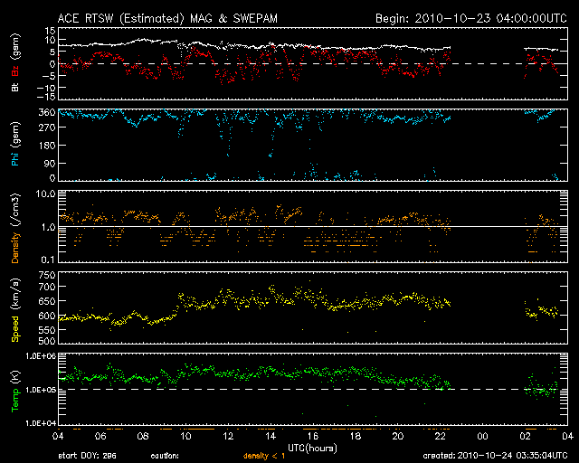 2010/10/24 12:32 更新 650km/秒の高速風が続き、活発なオーロラを起こしています。1117黒点群が大きくなっています。 担当 篠原 太陽風の速度は、昨日の午後に650km/秒へと更に上昇し、 かなり高い速度の太陽風となっています。 ACEのデータが一部欠けていますが、 今朝くらいから若干下がり、現在は620km/秒となっていますが、 高速の太陽風は依然続いています。 磁場強度も、まだ若干高めの状態を保っています。 昨日は一時10nT近くまで上がりましたが、現在は6nTほどです。 まだ弱まっていないことから、高速風領域の中盤の段階にあると思われます。 太陽風磁場の南北成分は、+5nTから-5nTの間を頻繁に南北に切り替わっています。 この変化を受けて、オーロラ活動もかなり活発に発生しました。 AE指数では、1200nTに達する大規模な変動も記録されています。 その前後も、500nTから1000nTの中規模の活動が頻繁に発生しています。 アラスカのライブカメラはあいにく曇りで、 オーロラの様子を直接見ることができませんでしたが、 晴れた地域ではきれいなオーロラを眺めることができたのではないでしょうか。 SOHO EIT195を見ると、太陽の中心付近を南北に伸びるコロナホールは、 太陽の西側に迫り出し、この領域の影響もそろそろ到来するタイミングです。 高速の太陽風は、更に数日間継続するのではないかと思います。 こうなると、次に注目されるのは放射線帯の高エネルギー電子の増加です。 今日のGOESのグラフでは、まだ増加は見られず、低いレベルを保っています。 今後、増加を始める可能性があるので、注意してください。 太陽では、北東(左上)の1117黒点群に小さな黒点が多数発生しています。 Bクラスの小さなフレアを起こしていますが、 今のところ活動度は特に高まってはいない様です。 こちらも、今後の変化に注目してください。 拡大した1117黒点群の詳細。SDO HMII の太陽可視光写真による. (c) SDO (NASA) ![]() SOHO衛星のEIT195カメラによる太陽コロナの様子 (c) SOHO (ESA & NASA) ![]() SOHO衛星による太陽の可視光写真。マウスの矢印を写真に重ねると、黒点番号付きの写真に切り替わります。 (c) SOHO (ESA & NASA) ![]() ACEが観測した太陽風の磁場(1番上の枠、白線は全体の強度、赤線は南北成分) および、太陽風の密度(3番目の橙線)、速度(4番目の黄線) (c) NOAA/SWPC ![]() リアルタイムAE指数 下段のAEグラフの値が高くなると、オーロラ活動が活発化しています。 (c) 京都大学, NICT ![]() 27日の太陽周期に合わせたデータプロット 太陽が同じ面を地球に向けていた27日前の変化から、今後を予想することができます。 (c) 作図:宇宙天気ニュース