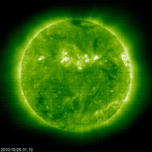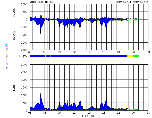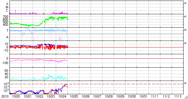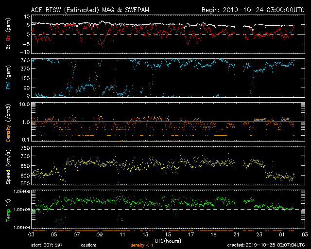 2010/10/25 11:07 更新 600km/秒台の高速太陽風が続いています。オーロラも活発です。 担当 篠原 太陽風の速度は、昨日のニュースの後に再び上がって、650km/秒を超えました。 その状態をほぼ一日にわたって継続し、今朝になって600km/秒へ若干下がったところです。 依然、高い速度の太陽風が続いています。 磁場強度は、6nTからゆっくりと5nTを切りそうなところまで下がっています。 しかし、まだ弱まっと言うほどの状態にはなっておらず、 高速風はもうしばらく現在の高い速度を保つ可能性があります。 オーロラ活動も活発です。 AR指数は、500nTから1000nTの中規模活動が頻繁に観測されています。 今回の高速風を受けて、放射線帯の高エネルギー電子が大きく増加を始めました。 GOES11は、警戒レベルの10,000にほぼ達しています。 GOES12はまだですが、今後も増加は続きそうなので、 両衛星で10,000に達するだろうと思われます。 衛星の運用などでは注意が必要な状況です。 高速太陽風は、もう2〜3日程度続くのではないかと思います。 コロナホールの分布は、東西方向には狭かったので、 それ以上長く続くこともないのではないかと思います。 磁場強度が下がってくると、速度の低下も近くなります。 引き続き注目して下さい。 太陽は、中心やや左上の1117黒点群がBクラスの小さなフレアを頻繁に起こしています。 特に大きな活動はありませんが、Cクラスなどのフレアに発展する可能性はあります。 また、1117群の右手に、新しく1119黒点群が発生しています。 このところ太陽は、黒点の発生に関しては、なかなかにぎやかになっています。 SOHO衛星のEIT195カメラによる太陽コロナの様子 (c) SOHO (ESA & NASA) ![]() SOHO衛星による太陽の可視光写真。マウスの矢印を写真に重ねると、黒点番号付きの写真に切り替わります。 (c) SOHO (ESA & NASA) ![]() ACEが観測した太陽風の磁場(1番上の枠、白線は全体の強度、赤線は南北成分) および、太陽風の密度(3番目の橙線)、速度(4番目の黄線) (c) NOAA/SWPC ![]() リアルタイムAE指数 下段のAEグラフの値が高くなると、オーロラ活動が活発化しています。 (c) 京都大学, NICT ![]() 27日の太陽周期に合わせたデータプロット 太陽が同じ面を地球に向けていた27日前の変化から、今後を予想することができます。 (c) 作図:宇宙天気ニュース