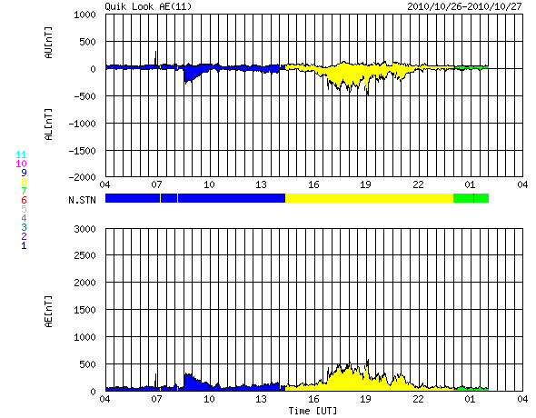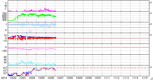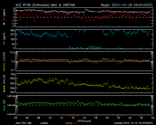 2010/10/27 12:31 更新 太陽風の速度は550km/秒に下がり、後半に入っています。太陽活動は現在は穏やかです。 担当 篠原 高速太陽風はピークを過ぎたようです。 昨夜から太陽風の速度はゆっくりと下がり始め、今朝の段階で550km/秒となっています。 高速の状態は続いていますが、それほど高い速度ではなくなりました。 速度とともに、磁場強度も弱まっています。 昨日の4nTから、現在は3nTほどに下がっています。 磁気圏の活動は、小規模ながら続いています。 AE指数は最大で500nTほどの活動になっていますが、 オーロラ活動は数時間程度発生しています。 27日周期の図を見ると、前周期もそろそろ高速風は終わりに近づいています。 今周期も、このまま低速風に変わっていく可能性があります。 一方、SOHO EIT195を見ると、太陽の南半球側に淡いコロナホールが広がっています。 この領域の影響が2〜3日後くらいにやって来るかもしれません。 それが特になければ、低速の穏やかな太陽風がしばらく続くでしょう。 太陽では、1117黒点群が大きな姿を見せています。 このくらい大きいと、肉眼で直接見えるかもしれません。 減光に十分な注意が必要ですが、天気が良ければ挑戦してみてはいかがでしょうか。 黒点は大きいですが、活動度は下がっているようです。 X線のグラフは、全体の強度が次第に弱まり、 小さなフレアの変動も見られなくなっています。 黒点の活動は、一旦弱まって再び強まるということもよく見られます。 黒点群の規模は大きいので、引き続き注意する必要があるでしょう。 SOHO衛星のEIT195カメラによる太陽コロナの様子 (c) SOHO (ESA & NASA) ![]() SOHO衛星による太陽の可視光写真。マウスの矢印を写真に重ねると、黒点番号付きの写真に切り替わります。 (c) SOHO (ESA & NASA) ![]() ACEが観測した太陽風の磁場(1番上の枠、白線は全体の強度、赤線は南北成分) および、太陽風の密度(3番目の橙線)、速度(4番目の黄線) (c) NOAA/SWPC ![]() リアルタイムAE指数 下段のAEグラフの値が高くなると、オーロラ活動が活発化しています。 (c) 京都大学, NICT ![]() 27日の太陽周期に合わせたデータプロット 太陽が同じ面を地球に向けていた27日前の変化から、今後を予想することができます。 (c) 作図:宇宙天気ニュース