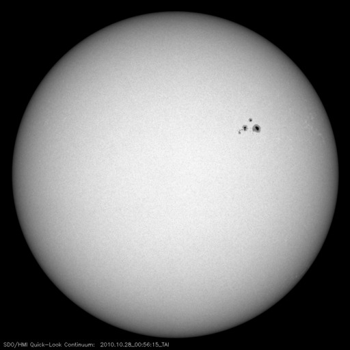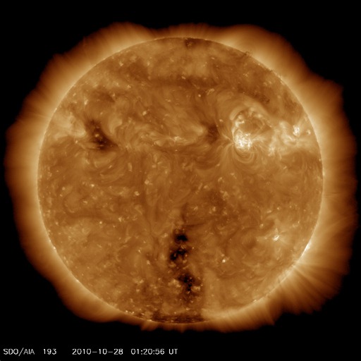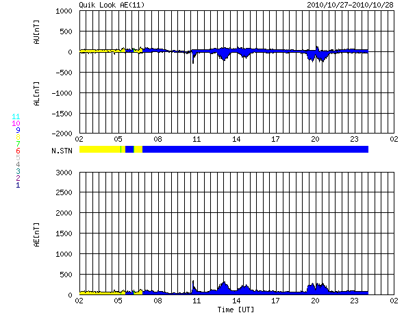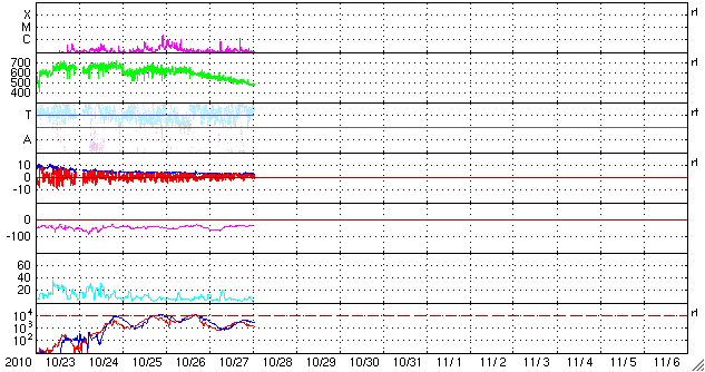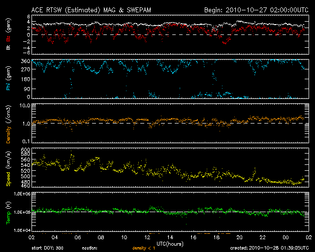 2010/10/28 10:40 更新 太陽風の速度は480km/秒に下がり、高速風は終わりつつあります。 担当 篠原 太陽風の速度はじわじわと下がり、480km/秒と高速風ではなくなりつつあります。 このまま下がっていくのか、 太陽の南半球側に見えていた小規模のコロナホールの影響で、 もうしばらく高速状態が続くのか、 引き続き注目してください。 磁気圏のオーロラ活動は、だいぶ穏やかになっています。 AE指数は、250nTほどの小さな変動がぽつぽつと見られる程度です。 太陽風の磁場強度は3nTに弱まり、その上、南北成分は北寄りの傾向です。 このために、速度はまだある程度高いのですが、 磁気圏へのエネルギーの流れ込みは弱まっているのでしょう。 今日はSDO衛星のAIA193の太陽コロナ写真を掲載しています。 南半球のやや緯度の高い領域(写真では下の方)に、南北に伸びたコロナホールが見えます。 くっきりと目立って見えていますが、 SDO AIA193では、コロナホールはSOHO EIT195よりも濃く、はっきりと見える傾向があります。 違う機器のデータを見るときは、それぞれの特徴を考えて見比べる必要があります。 ちょうど太陽の中心線に来ていることから、3日後くらいに影響がやって来るかもしれません。 放射線帯の高エネルギー電子は、少し下がって、 警戒レベルを割りました。 この後も、少しずつ減少を続けるでしょう。 太陽では、1117黒点群が大きな姿を見せています。 28日2時(世界時27日17時)に、C1.2の小規模フレアを起こしていますが、 活動度が上がったということはありません。 比較的穏やかです。 SDO衛星のAIA193カメラによる太陽コロナの様子 (c) SDO (NASA) ![]() SDO衛星による太陽の可視光写真 (c) SDO (NASA) ![]() ACEが観測した太陽風の磁場(1番上の枠、白線は全体の強度、赤線は南北成分) および、太陽風の密度(3番目の橙線)、速度(4番目の黄線) (c) NOAA/SWPC ![]() リアルタイムAE指数 下段のAEグラフの値が高くなると、オーロラ活動が活発化しています。 (c) 京都大学, NICT ![]() 27日の太陽周期に合わせたデータプロット 太陽が同じ面を地球に向けていた27日前の変化から、今後を予想することができます。 (c) 作図:宇宙天気ニュース