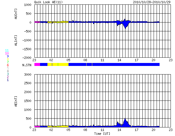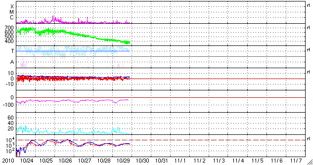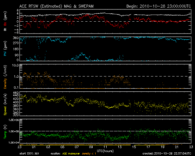 2010/10/30 07:57 更新 太陽風は平均的な速度で安定し、磁気圏は静穏です。 担当 篠原 太陽風の速度は、420km/秒から380km/秒へやや下がりましたが、 平均的な速度で安定しています。 磁場強度は、3nTとやや弱い値を保っています。 磁気圏も静穏で、オーロラの活動度を示すAE指数は、 小さな変動が1回発生した程度です。 ACEのデータに戻ると、このAE指数の変動にやや先行して、 磁場の南北成分(ACEの赤線)が南向き(マイナス方向)になっています。 この影響で発生したのでしょう。 今日は、SDOの小さいAIA193写真を掲載しています。 ちょっと見にくいですが、南半球側のコロナホールは次第に西側に進行し、 もう1日ほどで地球への影響が始まる目安の位置に達しそうです。 それまでは、現在の穏やかな太陽風が続くと思われます。 放射線帯の高エネルギー電子は、2000ほどのレベルで安定しています。 太陽の可視光写真も、今日はSDOの小さい写真です。 1117黒点群は、特に変化は見られません。 X線グラフを見ると、1117黒点群はBクラスの小さな変化を度々起こしているようです。 昨日よりも頻度が少し上がっていますが、 さらに活動が高まるのかどうか注目してください。 SDO衛星のAIA193カメラによる太陽コロナの様子 (c) SDO (NASA) ![]() SDO衛星による太陽の可視光写真 (c) SDO (NASA) ![]() ACEが観測した太陽風の磁場(1番上の枠、白線は全体の強度、赤線は南北成分) および、太陽風の密度(3番目の橙線)、速度(4番目の黄線) (c) NOAA/SWPC ![]() リアルタイムAE指数 下段のAEグラフの値が高くなると、オーロラ活動が活発化しています。 (c) 京都大学, NICT ![]() 27日の太陽周期に合わせたデータプロット 太陽が同じ面を地球に向けていた27日前の変化から、今後を予想することができます。 (c) 作図:宇宙天気ニュース
