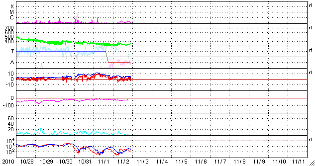 2010/11/ 3 07:38 更新 330km/秒ほどの低速の太陽風が続いています。太陽も穏やかです。 担当 篠原 太陽は、北東部(左上)に1120黒点群だけ見えています。 この1120黒点群は、左右にやや離れた2カ所に黒点があります。 微妙に距離が開いているため、別の黒点群の様にも見えますが、 この点は磁場の写真で見るとはっきりします。 今日の1枚目に掲載しているSOHOの磁場写真を見ると、 右側の黒点は黒に、右側の黒点は白くなっています。 これは、それぞれ磁石のS極、N極に相当し、 1120黒点群は、この2つでひとつの組になっているのです。 GOESのX線データは、特にフレアは起きていませんが、 最後の半日ほど、強度がやや高まっています。 これは、SDO AIA193の太陽コロナ写真で、 南東の端(左下)から明るい活動領域が近付いているからだと思われます。 ここは、前周期に1112黒点群があった場所で、 あと3日ほどすると見えてくるでしょう。 STEREO Behindの様子では、現在は小さな変動を起こしている程度の様ですが、 どのような黒点があるのかなど、注目してください。 太陽風の速度は、320km/秒から340km/秒の間をゆっくりと変化しています。 磁場強度は5nTと平均的な値を保っています。 太陽風は、低速状態で安定しています。 磁気圏では、オーロラの活動はほとんど見られず、 AE指数は、ほとんど変化していません。 今日あたり、太陽の北半球側に見えていた小さなコロナホールの影響が見られるかもしれません。 やって来ても、小規模の速度の上昇程度だと思います。 もしくは、このまま低速風が続くかもしれません。 27日周期の図を見ると、前周期のこの期間は太陽風はずっと低速です。 オーロラの活動など、しばらくは低調なままでしょう。 SOHOによる、太陽の磁場写真。北東部に1120黒点群の磁場の強まりが見える。 (c) SOHO (ESA & NASA) ![]() SDO衛星のAIA193カメラによる太陽コロナの様子 (c) SDO (NASA) ![]() SOHO衛星による太陽の可視光写真。マウスの矢印を写真に重ねると、黒点番号付きの写真に切り替わります。 (c) SOHO (ESA & NASA) ![]() GOES衛星の太陽X線データ (c) NOAA/SWPC ![]() ACEが観測した太陽風の磁場(1番上の枠、白線は全体の強度、赤線は南北成分) および、太陽風の密度(3番目の橙線)、速度(4番目の黄線) (c) NOAA/SWPC ![]() リアルタイムAE指数 下段のAEグラフの値が高くなると、オーロラ活動が活発化しています。 (c) 京都大学, NICT ![]() 27日の太陽周期に合わせたデータプロット 太陽が同じ面を地球に向けていた27日前の変化から、今後を予想することができます。 (c) 作図:宇宙天気ニュース
