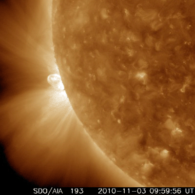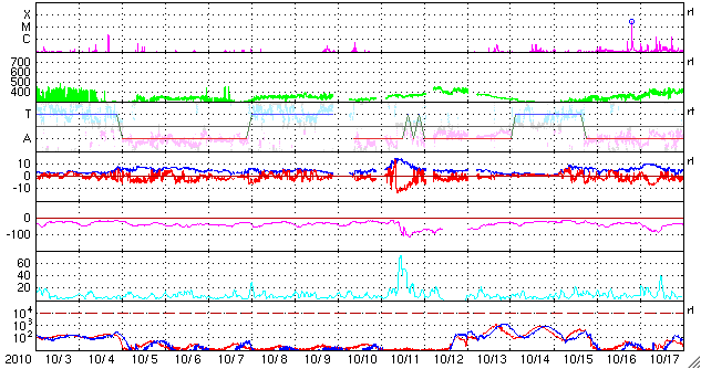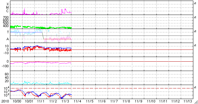 2010/11/ 4 11:03 更新 太陽の東端で、Cクラスのフレアが発生しています。太陽風は低速ですが、弱いオーロラ活動が発生しています。 担当 篠原 太陽の東端で、3つのCクラス小規模フレアが発生しました。 3日15時(世界時3日6時)に、C3.8、 3日21時(世界時3日12時)に、C4.9とC3.4です。 フレアを起こした活動領域は、まだ東端の向こう側にあったので、 本当のフレアの規模は、もう一回り大きかった可能性があります。 この様子を、SDOのAIA193の動画で紹介します。 フレアの後に発生したポストフレアループが美しく光り輝いています。 この活動領域は、そろそろ太陽のこちら側に顔を出します。 どの様な黒点があるのか、また、フレア活動はどうなるのかなど注目してください。 太陽風は、速度340km/秒から320km/秒と低速の状態で安定しています。 磁場強度は、5nT付近と平均的な強さです。 ただし、磁場の南北成分の傾向が、南寄りに切り替わっています(赤線がマイナス方向に偏っている)。 -2nTから-4nTほどの南向きが、変動しながら続いています。 このため、小規模のオーロラ活動が発生するようになり、 AE指数では、200〜400nTの変動が度々観測されています。 激しくはありませんが、北極の空を彩っていたのでしょう。 低速の太陽風は、この後も継続します。 27日周期の図では、前周期のグラフはずっと低速です。 今後も、磁場の南北成分の変化によって、 弱いオーロラ活動が発生したり(南寄りのとき)、ほとんど現れなくなったり(北寄りのとき)、 といった変化が見られるでしょう。 SDO AIA 193による、太陽の東端で発生したフレアとポストフレアループ。 (c) SDO (NASA)、動画加工 : 宇宙天気ニュース ![]() SDO衛星のAIA193カメラによる太陽コロナの様子 (c) SDO (NASA) ![]() SDO衛星による太陽の可視光写真 (c) SDO (NASA) ![]() GOES衛星の太陽X線データ (c) NOAA/SWPC ![]() ACEが観測した太陽風の磁場(1番上の枠、白線は全体の強度、赤線は南北成分) および、太陽風の密度(3番目の橙線)、速度(4番目の黄線) (c) NOAA/SWPC ![]() リアルタイムAE指数 下段のAEグラフの値が高くなると、オーロラ活動が活発化しています。 (c) 京都大学, NICT ![]() 27日の太陽周期に合わせたデータプロット 太陽が同じ面を地球に向けていた27日前の変化から、今後を予想することができます。 (c) 作図:宇宙天気ニュース