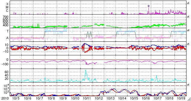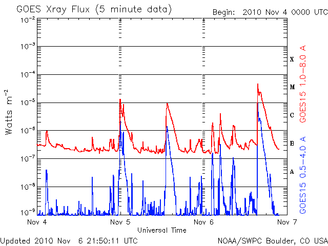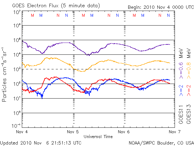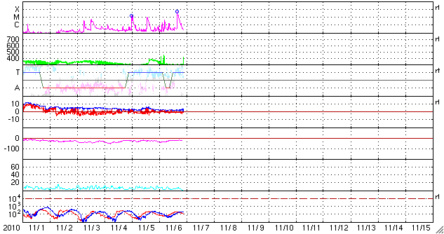 - 2010/11/ 6 12:18 1121黒点群で、M1.0の中規模フレアが発生しました。磁気圏は静穏です。