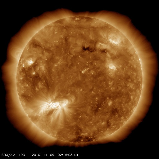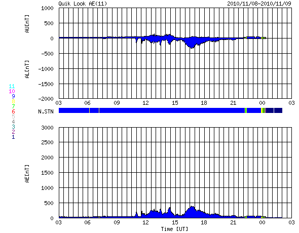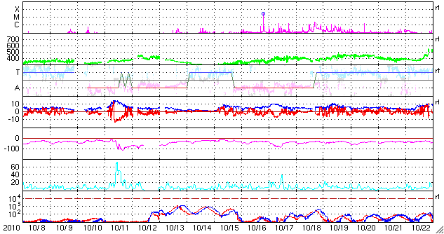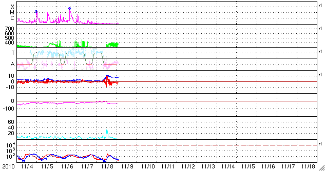 2010/11/ 9 11:48 更新 太陽のフレア活動は穏やかになっています。太陽風の速度はやや上昇しましたが、低速風が続いています。 担当 篠原 1121黒点群のフレア活動は、一段落となっています。 昨日の朝以降、X線のデータはレベルがやや下がり、フレアの変化はなくなっています。 このまま弱まっていくのか、一休みの後、再び活動を強めるのか、 もうしばらく注目してください。 太陽では、中心からやや北西(右上)側にも、小さな1122黒点群が見えています。 こちらも特に活動はしていません。 太陽風は、昨夜、8日21時(世界時8日12時)頃から、速度がやや上昇し、 それまでの280km/秒とかなり遅い状態から、 370km/秒とやや遅めという速度に変わりました。 それに先立って、磁場強度も一時的に10nTを超えるほどにまで強まっています。 磁場強度は、速度が上昇するとともに下がり始め、現在は7nT程度に下がっています。 太陽風の変動の影響で、磁気圏でも小規模のオーロラ活動が発生しています。 AE指数のグラフでは、 図の中ほどに300nT程の変化が数時間にわたって観測されています。 今回の太陽風の変化は小規模で、 この後も基本的には低速の穏やかな状態が続くと思われます。 SDO衛星のAIA193カメラによる太陽コロナの様子 (c) SDO (NASA) ![]() SDO衛星による太陽の可視光写真 (c) SDO (NASA) ![]() GOES衛星の太陽X線データ (c) NOAA/SWPC ![]() ACEが観測した太陽風の磁場(1番上の枠、白線は全体の強度、赤線は南北成分) および、太陽風の密度(3番目の橙線)、速度(4番目の黄線) (c) NOAA/SWPC ![]() リアルタイムAE指数 下段のAEグラフの値が高くなると、オーロラ活動が活発化しています。 (c) 京都大学, NICT ![]() 27日の太陽周期に合わせたデータプロット 太陽が同じ面を地球に向けていた27日前の変化から、今後を予想することができます。 (c) 作図:宇宙天気ニュース