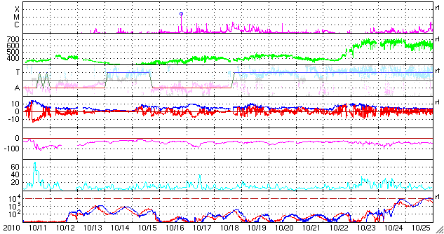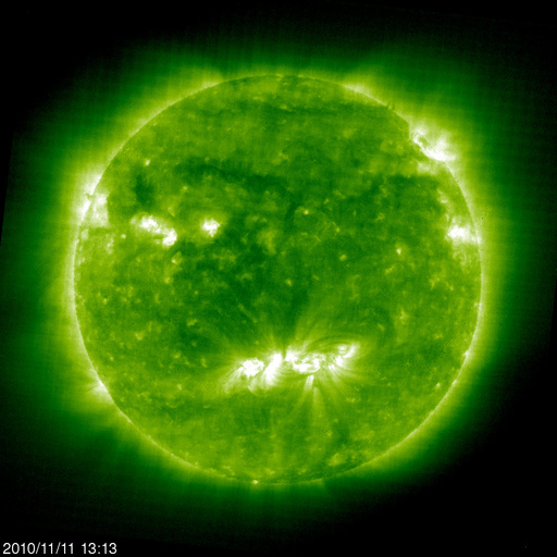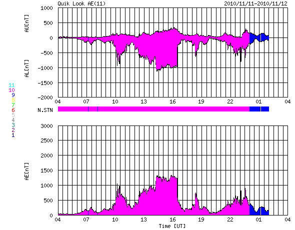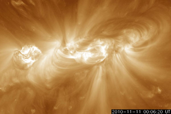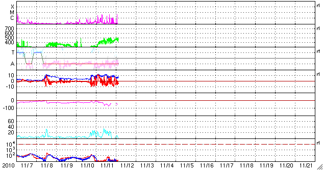 2010/11/12 12:12 更新 1123黒点群が小規模フレアを多発させています。太陽風の変動によってオーロラが活発になりました。 担当 篠原 太陽の南半球側中心付近の1123黒点群は、活動を更に活発化し、 Cクラスの小規模フレアを多数起こしています。 昨日より、C4.7、C2.2、C4.3、C1.1、そして、つい先程のC4.6です。 GOESのX線データは、とてもにぎやかなグラフになっています。 その活発な活動の様子を、SDO衛星のAIA 193カメラの画像から動画で紹介します。 拡大画像からの切り抜きなので、迫力のある映像になっています。 動画では、左右にふたつの領域が見られますが、 左側は1123黒点群、右側はしばらく前に活発だった1121黒点群です。 この動画を見ると、1121黒点群も依然として活動を続けていることが分かります。 1123黒点群は、更に大きなフレアを発生させるかもしれません。 Mクラスの中規模を含めて、注意する必要があるでしょう。 また、SDOのデータを見ていると、北半球側の1124黒点群も小さな活動を続けています。 こちらの変化にも注意する必要がありそうです。 一方、昨日は、太陽風にも変化がやって来ました。 ニュースの後くらいから、速度が変化を始めて400km/秒と平均的な速度レベルを回復し、 その後1日ほどかけて、現在は450km/秒とやや高速の状態にまで上がっています。 磁場強度も、今朝くらいまで10nT近くに強まった状態が続き、 南北成分は、時々、-10nTに及ぶ強い南向きを観測しました。 速度と南向き磁場の変動が重なり、かなり活発なオーロラ活動を地球にもたらしています。 AE指数では、500nTを超えて、1000nTに及ぶほどのにぎやかな変化が記録されています。 (最大1300nTに達する変化も記録されていますが、 ここはデータエラーが含まれている可能性があります) 昨夜は、アラスカのライブカメラ(Live! オーロラ)でも、 かなり活発なオーロラの変化を楽しむことができました。 ACEのデータでは、太陽風の磁場強度は、次第に5nTに近くなり、 太陽風の変動は後半に近づいているように思われます。 磁場強度が下がったことで、今後は、オーロラの規模は次第に小さくなりそうです。 それでも、速度が高まっている間は、もうしばらくオーロラを楽しむことができるでしょう。 SDO AIA 193による、1123黒点群のフレアの様子。 (c) SDO (NASA)、動画加工 : 宇宙天気ニュース ![]() SOHO衛星のEIT195カメラによる太陽コロナの様子 (c) SOHO (ESA & NASA) ![]() SOHO衛星による太陽の可視光写真。マウスの矢印を写真に重ねると、黒点番号付きの写真に切り替わります。 (c) SOHO (ESA & NASA) ![]() GOES衛星の太陽X線データ (c) NOAA/SWPC ![]() ACEが観測した太陽風の磁場(1番上の枠、白線は全体の強度、赤線は南北成分) および、太陽風の密度(3番目の橙線)、速度(4番目の黄線) (c) NOAA/SWPC ![]() リアルタイムAE指数 下段のAEグラフの値が高くなると、オーロラ活動が活発化しています。 (c) 京都大学, NICT ![]() 27日の太陽周期に合わせたデータプロット 太陽が同じ面を地球に向けていた27日前の変化から、今後を予想することができます。 (c) 作図:宇宙天気ニュース