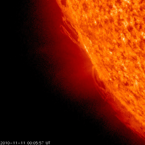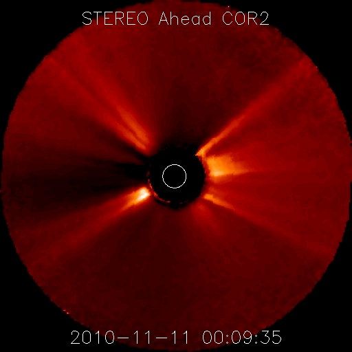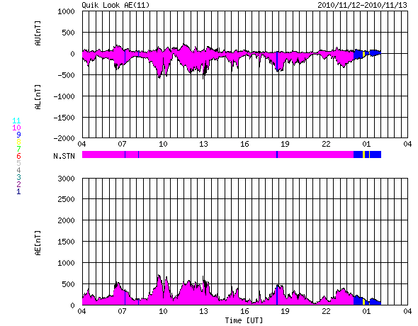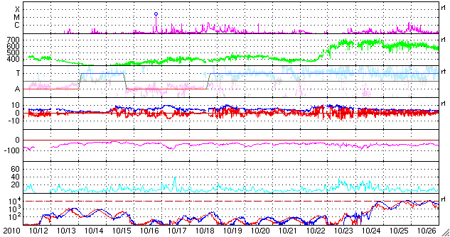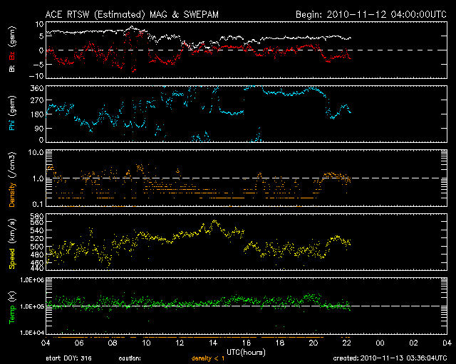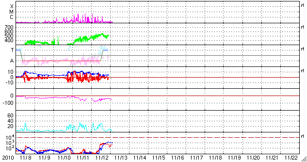 2010/11/13 12:36 更新 太陽のフレア活動は落ち着いています。高速太陽風は500km/秒台に上がっています。 担当 篠原 頻繁に小規模フレアを起こしていた1123黒点群の活動は、 昨夜、12日23時(世界時12日14時)のC1.5小規模フレアを最後に、 半日ほど静まっています。 これで一段落なのか、一休みの後再び活動を強めるのか、 引き続き注視する必要があります。 一方、北半球側の1124黒点群は、黒点の数が増えて規模が拡大しているようです。 フレア活動はまだ目立つほどではありませんが、更に発達が続くようなら、 フレアの規模も大きくなる可能性があります。 また、太陽の南半球の東端から黒点群が上がってきました。 1126黒点群と番号が付けられています。 STEREO Behindによると、あまり活動的ではないようです。 この1126黒点群付近で、プロミネンスのダイナミックな動きが見られたので、 動画で紹介します。 撮影したのは、SDO衛星AIA304カメラです。 この変動を詳しく説明することはできませんが、眺めているだけでも楽しい映像です。 太陽風は、昨日のニュースの後更にもう一段速度が上がり、500km/秒台に入りました。 立派な高速風領域です。 12日23時(世界時12日14時)頃に550km/秒まで達し、この辺りを最高速度として、 以降は500km/秒付近で安定しています。 磁場強度も、最高速度に達するまでは5nTを超えるくらいの強さを保っていたのですが、 その後は3〜4nTに弱まっています。 27日周期の図によると、最高速度の辺りで、 太陽風磁場の大まかな方向が「A」から「T」へ切り替わっています。 今回の高速風の発生源の様子と関係する変化なのでしょう。 オーロラも中規模の活動が連続しています。 AE指数では、500nTの変動が3時間おきくらいに連続して発生しています。 アラスカのライブカメラでも、きれいな活動を眺めることができました。 今後の太陽風の予想ですが、いくつかの要素があります。 今回の高速風の原因がややはっきりしないのですが、 8日頃に見えていた小さなコロナホールの影響であれば、そろそろ終わりに近づくでしょう。 (高速風は、7日に発生したMクラスフレアの影響かもしれません) 一方、SOHO EIT195を見ると太陽の北半球側に淡いコロナホールが分布しています。 この影響が明日、明後日くらいからやって来るかもしれません。 また、今日の2枚目の動画で紹介していますが、1123黒点群で頻発したフレアに伴って、 11日から12日にかけて、CME(太陽ガスの放出現象)も断続的に発生しています。 (動画で左に向かって吹き出しているガスに注目してください) 地球から見てちょうど太陽の中心付近で発生しているので、 3〜4日後くらいに影響がやって来そうです。 こちらも明日、明後日以降、太陽風に変動をもたらす要因です。 27日周期の予想では、しばらく静かな時間が続きそうでしたが、 明日以降、太陽風の変化やオーロラの活動に注目してください。 また、今回の高速太陽風の影響で、放射線帯の高エネルギー電子も増加しています。 まだ、1000に達した程度ですが、今後の変動に関係して、 こちらへの注意も必要になるかもしれません。 SDO AIA304による、太陽東端のプロミネンスの活動。 (c) SDO (NASA)、動画加工 : 宇宙天気ニュース ![]() STEREO Aheadによる、CMEの吹き出しの様子。左が地球の方向。 (c) STEREO (NASA)、動画加工 : 宇宙天気ニュース ![]() SOHO衛星のEIT195カメラによる太陽コロナの様子 (c) SOHO (ESA & NASA) ![]() SDO衛星による太陽の可視光写真 (c) SDO (NASA) ![]() GOES衛星の太陽X線データ (c) NOAA/SWPC ![]() ACEが観測した太陽風の磁場(1番上の枠、白線は全体の強度、赤線は南北成分) および、太陽風の密度(3番目の橙線)、速度(4番目の黄線) (c) NOAA/SWPC ![]() リアルタイムAE指数 下段のAEグラフの値が高くなると、オーロラ活動が活発化しています。 (c) 京都大学, NICT ![]() 27日の太陽周期に合わせたデータプロット 太陽が同じ面を地球に向けていた27日前の変化から、今後を予想することができます。 (c) 作図:宇宙天気ニュース
