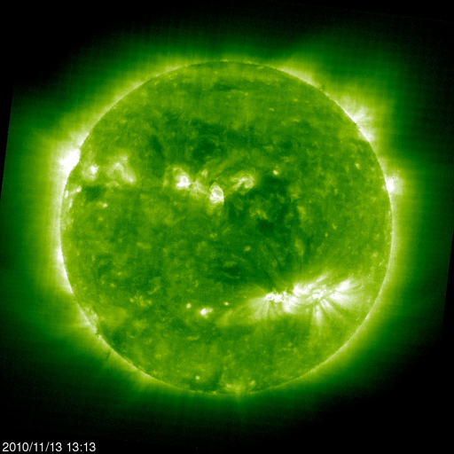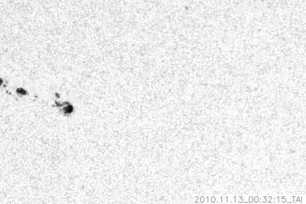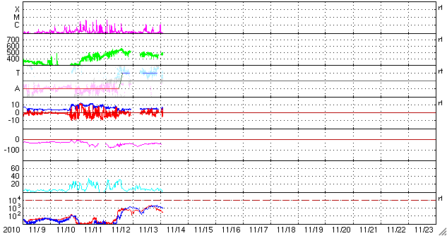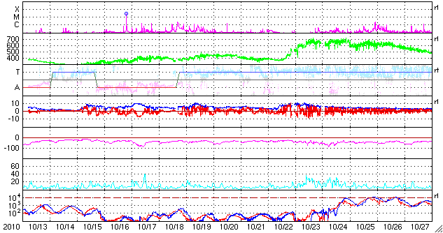 2010/11/14 12:05 更新 Cクラスのフレアが発生しています。太陽風はやや高速です。今後、高速風が強まる可能性があります。 担当 篠原 この数日、SDO衛星の太陽動画の掲載を続けていますが、 今日は、北半球側ほぼ中央の1124黒点群の変化を紹介しましょう。 大きな変化ではありませんが、黒点群のそれぞれの部分に、 横への移動や、ねじれ、新しい黒点の発生など、様々な変化があり、何度も見てしまう映像です。 その太陽は、昨日のニュース以降も、2つのCクラスフレアを起こしています。 13日20時半(世界時13日11時半)のC1.3と、14日9時(世界時14日0時)のC1.2です。 2つとも、南半球の1123黒点群で発生している様です。 フレアの規模は小さくなっていますが、1123黒点群は活動を続けています。 また、北半球側の1124黒点群と1125黒点群でも、Bクラスの小さな変動が発生しています。 この後も、大きくはありませんが、フレアの発生は続きそうです。 太陽風は、弱い高速太陽風が続いています。 昨日以降、速度は460km/秒前後で安定しています。 磁場強度は、5nTとやや強さを回復しているようです。 磁気圏は、小規模のオーロラ活動が数回発生している程度で、 それほど活動的ではありません。 昨日紹介したように、今後の太陽風は、コロナホールやCMEの影響がやって来て、 やや乱れた状態が続くのではないかと予想しています。 磁場強度が強まって、速度が上昇し、オーロラを活発に起こす可能性があります。 オーロラ観望には期待が持てそうです。 放射線帯の高エネルギー電子は、1000を超えたところで増加は止まっています。 次の太陽風の変化の後、再び注意が必要になるでしょう。 SDOの可視光写真による、1125黒点群の変化。 (c) SDO (NASA)、動画加工 : 宇宙天気ニュース ![]() SOHO衛星のEIT195カメラによる太陽コロナの様子 (c) SOHO (ESA & NASA) ![]() SOHO衛星による太陽の可視光写真。マウスの矢印を写真に重ねると、黒点番号付きの写真に切り替わります。 (c) SOHO (ESA & NASA) ![]() GOES衛星の太陽X線データ (c) NOAA/SWPC ![]() ACEが観測した太陽風の磁場(1番上の枠、白線は全体の強度、赤線は南北成分) および、太陽風の密度(3番目の橙線)、速度(4番目の黄線) (c) NOAA/SWPC ![]() リアルタイムAE指数 下段のAEグラフの値が高くなると、オーロラ活動が活発化しています。 (c) 京都大学, NICT ![]() 27日の太陽周期に合わせたデータプロット 太陽が同じ面を地球に向けていた27日前の変化から、今後を予想することができます。 (c) 作図:宇宙天気ニュース