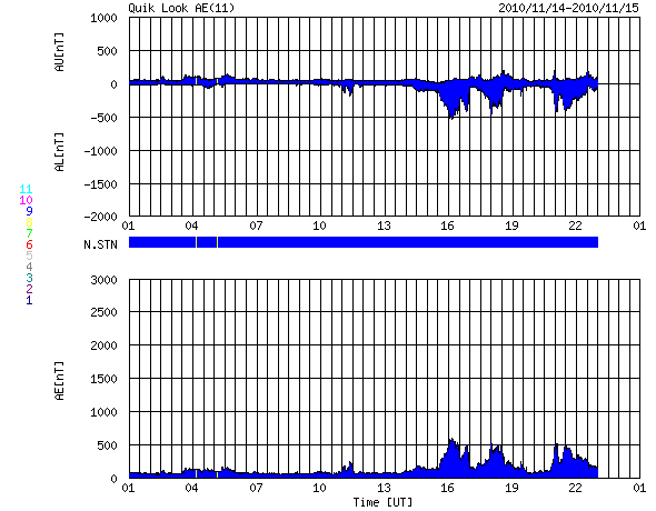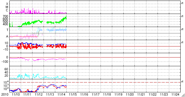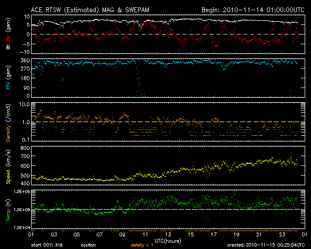 2010/11/15 09:25 更新 太陽風の速度は650km/秒近くまで高まり、高速風が強まっています。太陽は穏やかです。 担当 篠原 昨夜、14日19時(世界時14日10時)頃から太陽風の速度が上昇を始め、 今朝までに600km/秒台に上がりました。 現在の速度は、650km/秒付近になっています。 太陽の北半球側に見えていた、 コロナホールの影響がやって来たのではないかと思います。 太陽風の磁場強度にはあまり大きな変化はなく、 速度の上昇に先立って、5nTから8nTにやや強まった程度でした。 速度が高まった後、現在は再び5nTに戻りつつあります。 太陽風磁場の南北成分は、+5〜-5nTの範囲でゆっくりと変化しています。 このため、オーロラの活動がやや高まってきました。 AE指数では、500nT程度の変動が記録されています。 しかし、太陽風の速度が500km/秒を超え、600km/秒台に達していることを考えると、 オーロラの活動はもう一段強まっても良さそうに思います。 引き続き、磁気圏活動の推移に注目してください。 SOHO EIT195を見ると、 太陽の北半球側は、東端の近くまで、東西に細長くコロナホールが伸びています。 この影響が連続的にやって来るとすると、 これからしばらく高速太陽風の期間が続くかもしれません。 27日周期の図を見ると、前周期は10月23日以降に本格的な高速風が到来し、 6日間ほど続いていました。 その発生源が、今日の太陽の東端近くに見えているコロナホールです。 規模はやや縮小している様ですが、週末から来週の前半にかけて、 地球に影響を及ぼす可能性があります。 太陽は、昨日朝のC1.1小規模フレアを最後に、活動は落ち着いています。 可視光写真では、北半球側の1124黒点群が大きさを増していて、 それに合わせるように、昨日は小さなBクラスの変動が続いていました。 活動が強まるのか、現状程度までなのか、1124群の変化に注目してください。 SOHO衛星のEIT195カメラによる太陽コロナの様子 (c) SOHO (ESA & NASA) ![]() SOHO衛星による太陽の可視光写真。マウスの矢印を写真に重ねると、黒点番号付きの写真に切り替わります。 (c) SOHO (ESA & NASA) ![]() ACEが観測した太陽風の磁場(1番上の枠、白線は全体の強度、赤線は南北成分) および、太陽風の密度(3番目の橙線)、速度(4番目の黄線) (c) NOAA/SWPC ![]() リアルタイムAE指数 下段のAEグラフの値が高くなると、オーロラ活動が活発化しています。 (c) 京都大学, NICT ![]() 27日の太陽周期に合わせたデータプロット 太陽が同じ面を地球に向けていた27日前の変化から、今後を予想することができます。 (c) 作図:宇宙天気ニュース