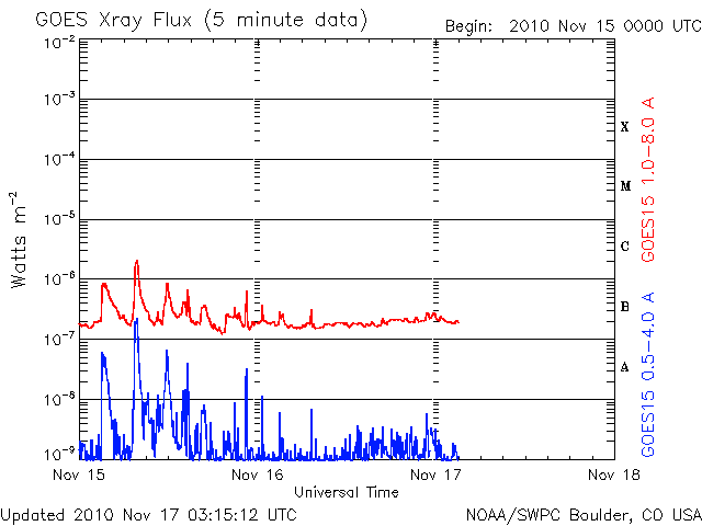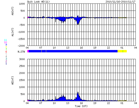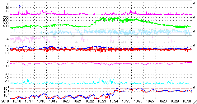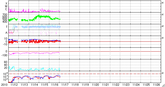 2010/11/17 12:20 更新 高速風は500km/秒台に下がっています。太陽は穏やかになっています。 担当 篠原 太陽風の速度は、500km/秒台前半と、 やや下がっていますが、現在も高速の状態を保っています。 磁場強度は、4nT前後とやや弱まっていて、 高速風としての勢いはなくなっているようです。 この後、速度は下がっていくのか、 小規模のコロナホールの影響を受けて、ある程度高速の状態を保つのか、 注目してください。 27日周期の図では、 前周期はこれから(10月23日から)強い高速風の領域が来ていたのですが、 現在は、コロナホールの様子が大きく変わっていて、 前周期ほど強い高速風はやって来ないと思われます。 どの程度の変化がやって来るでしょうか。 磁気圏のオーロラ活動は、AE指数で500nT程度の変動が2回発生している程度です。 高速風が弱まって来たことや、磁場の南北成分が比較的北寄りになっているためです。 太陽のフレア活動も穏やかになっています。 東の端から新しく1127黒点群が上がってきて、 X線の強度は少し高めで推移していますが、 フレアの活動はほとんど見られず、穏やかです。 1127群も、現状では特に活発と言うこともないようです。 放射線帯の高エネルギー電子は、数千のレベルで安定しています。 今回は、これ以上の目立った増加はないでしょう。 SOHO衛星のEIT195カメラによる太陽コロナの様子 (c) SOHO (ESA & NASA) ![]() SOHO衛星による太陽の可視光写真。マウスの矢印を写真に重ねると、黒点番号付きの写真に切り替わります。 (c) SOHO (ESA & NASA) ![]() ACEが観測した太陽風の磁場(1番上の枠、白線は全体の強度、赤線は南北成分) および、太陽風の密度(3番目の橙線)、速度(4番目の黄線) (c) NOAA/SWPC ![]() リアルタイムAE指数 下段のAEグラフの値が高くなると、オーロラ活動が活発化しています。 (c) 京都大学, NICT ![]() 27日の太陽周期に合わせたデータプロット 太陽が同じ面を地球に向けていた27日前の変化から、今後を予想することができます。 (c) 作図:宇宙天気ニュース