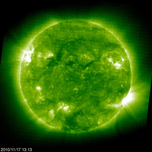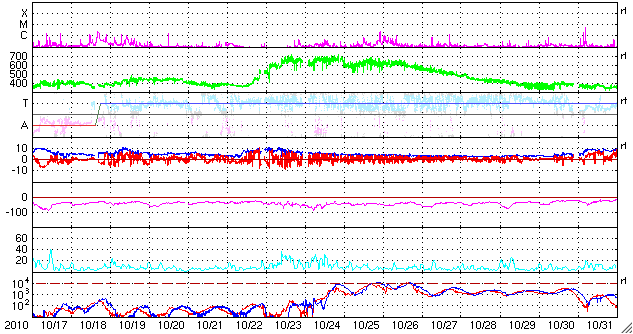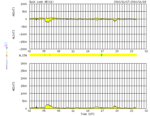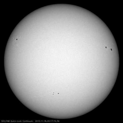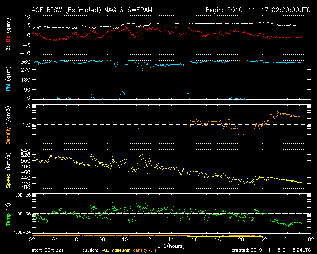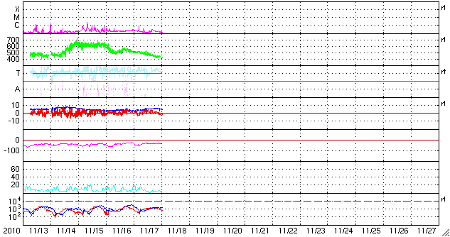 2010/11/18 10:16 更新 太陽風は平均的な速度に戻りました。太陽は黒点は目立ってますが、穏やかです。 担当 篠原 高速太陽風は、昨夜でひとまず終わり、 500km/秒から420km/秒へ下がってしまいました。 磁場強度は、5nTと平均的な強さに戻っています。 磁気圏は静穏で、AE指数はほとんど変化していません。 SOHO EIT195の太陽コロナを見ると、北半球側の細いコロナホールは、 もう1日ほどで、地球へ影響がやって来るタイミングにあります。 どの程度の影響があるか、これから4〜5日ほど注目してください。 太陽は、北西(右上)に1124黒点群、南東(左下)に1126黒点群、 北東(左上)に1127黒点群と、三方に黒点が目立っています。 SDOの動画を見ていると、小さな活動は起こっていますが、 それ以上規模が大きくなることはないようで、 X線のグラフでは、Bクラスの小さな変化がちらちら発生しているだけです。 太陽は、この後も穏やかに推移しそうです。 SOHO衛星のEIT195カメラによる太陽コロナの様子 (c) SOHO (ESA & NASA) ![]() SDO衛星による太陽の可視光写真 (c) SDO (NASA) ![]() ACEが観測した太陽風の磁場(1番上の枠、白線は全体の強度、赤線は南北成分) および、太陽風の密度(3番目の橙線)、速度(4番目の黄線) (c) NOAA/SWPC ![]() リアルタイムAE指数 下段のAEグラフの値が高くなると、オーロラ活動が活発化しています。 (c) 京都大学, NICT ![]() 27日の太陽周期に合わせたデータプロット 太陽が同じ面を地球に向けていた27日前の変化から、今後を予想することができます。 (c) 作図:宇宙天気ニュース