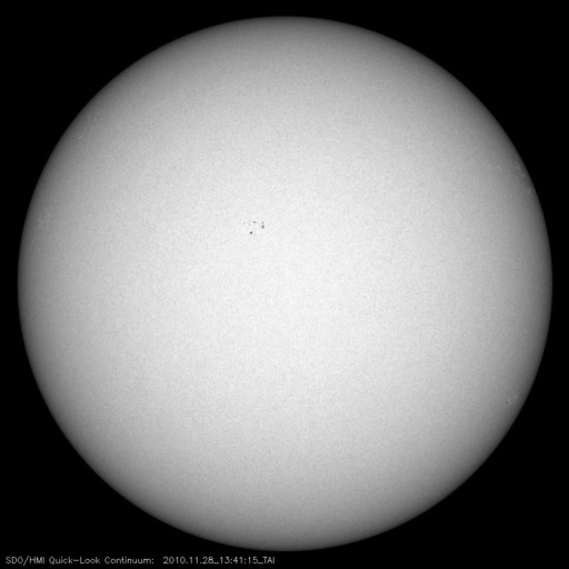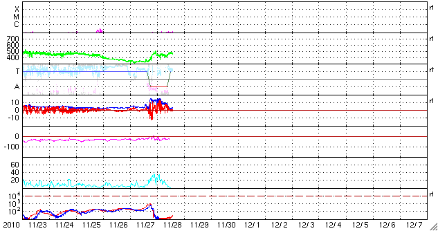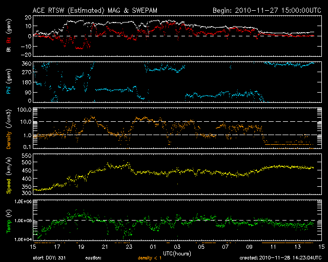 2010/11/28 23:24 更新 コロナホールの影響で、450km/秒のやや高速の太陽風になっています。新しい黒点が発生しています。 担当 篠原 今日は、昼間に記事の更新ができず、申し訳ありませんでした。 既にこの時間ですが、簡単に現況をまとめます。 太陽風は、弱い高速風になっています。 28日に入った頃から、速度の上昇が始まり、450km/秒に達しました。 以降、約1日にわたってこの状態が続いています。 太陽コロナに見えていた、小規模のコロナホールの影響が及んだためと思われます。 速度上昇に伴って、太陽風の磁場もかなり強まって、 最大15nTに達する変化となっています。 一時的に、-15nT近い強い南向きにもなっていて、 活発な磁気圏活動をもたらしたようです。 しかし、AE指数のデータが更新されておらず、 どの程度の活動になったのかは分かりません。 コロナホールの規模から考えて、高速風はあまり長く続かないと思います。 明日か明後日には下がって、穏やかな太陽風へ戻っていくのではないでしょうか。 その後は、しばらく穏やかな太陽風が続くでしょう。 太陽では、中央北寄りに新しい黒点群が発生しています。 特にフレア活動はありませんが、 この半日ほどでここまで拡大しており、しばらく注目して下さい。 SOHO衛星のEIT195カメラによる太陽コロナの様子 (c) SOHO (ESA & NASA) ![]() SDO衛星による太陽の可視光写真 (c) SDO (NASA) ![]() ACEが観測した太陽風の磁場(1番上の枠、白線は全体の強度、赤線は南北成分) および、太陽風の密度(3番目の橙線)、速度(4番目の黄線) (c) NOAA/SWPC ![]() リアルタイムAE指数 下段のAEグラフの値が高くなると、オーロラ活動が活発化しています。 (c) 京都大学, NICT ![]() 27日の太陽周期に合わせたデータプロット 太陽が同じ面を地球に向けていた27日前の変化から、今後を予想することができます。 (c) 作図:宇宙天気ニュース